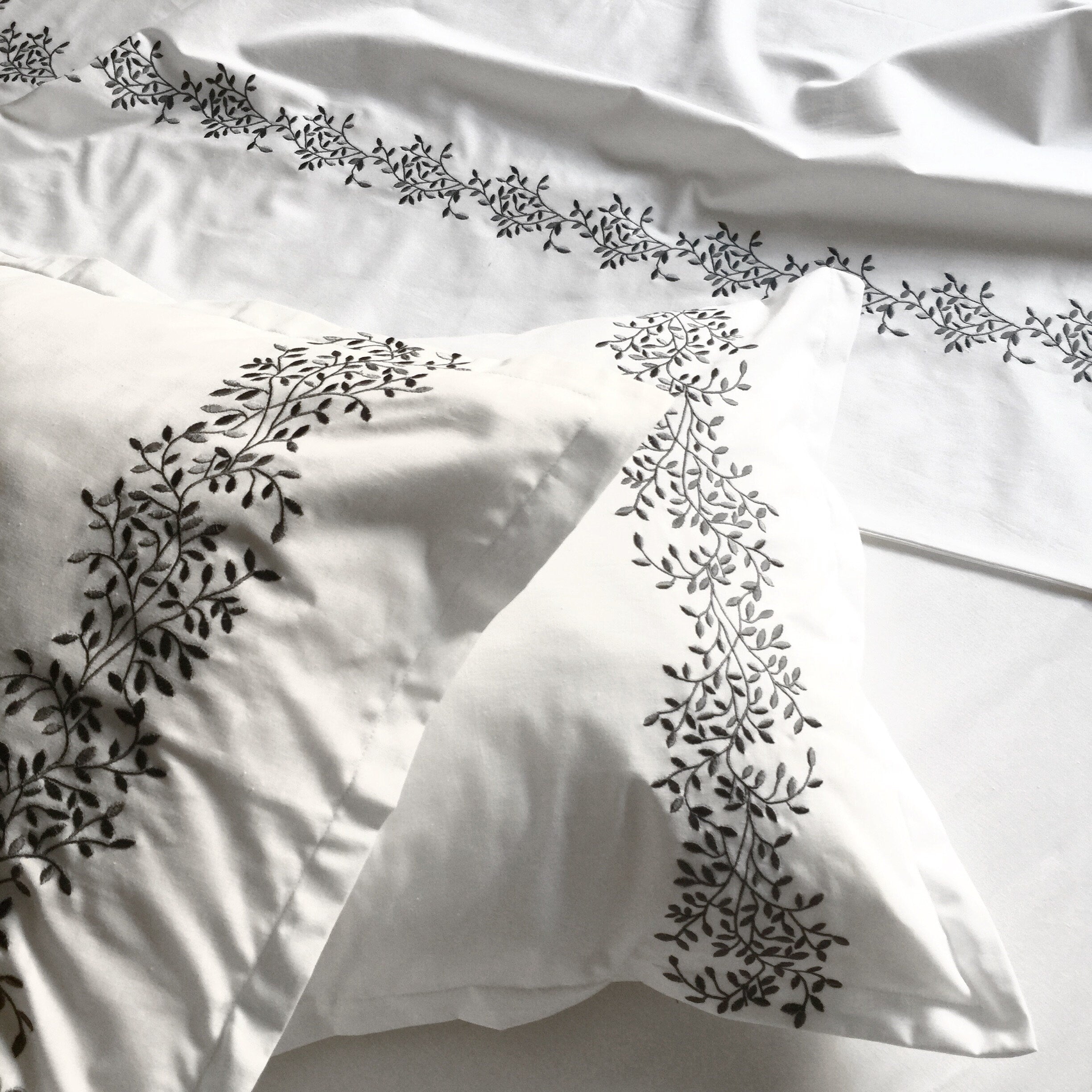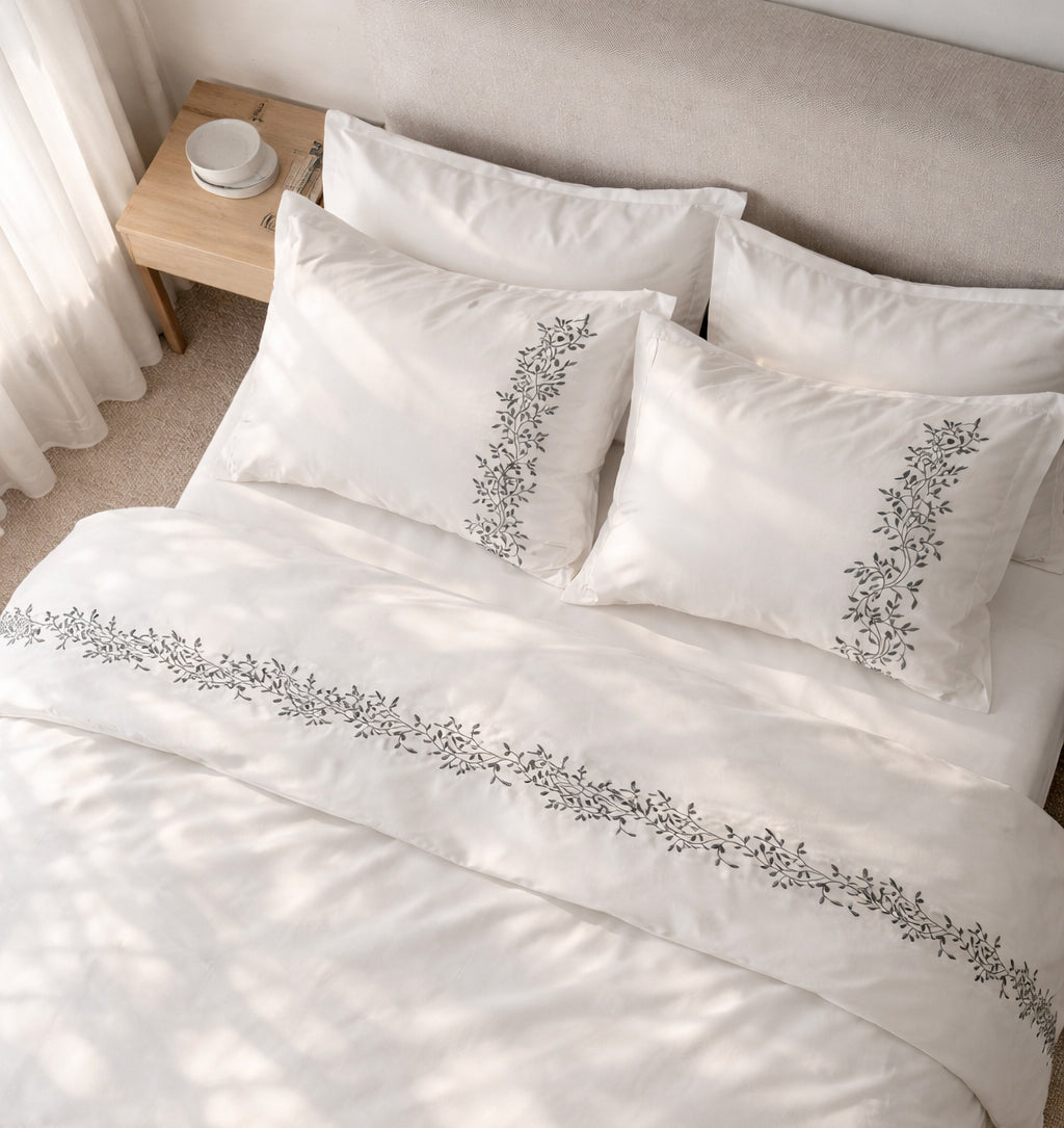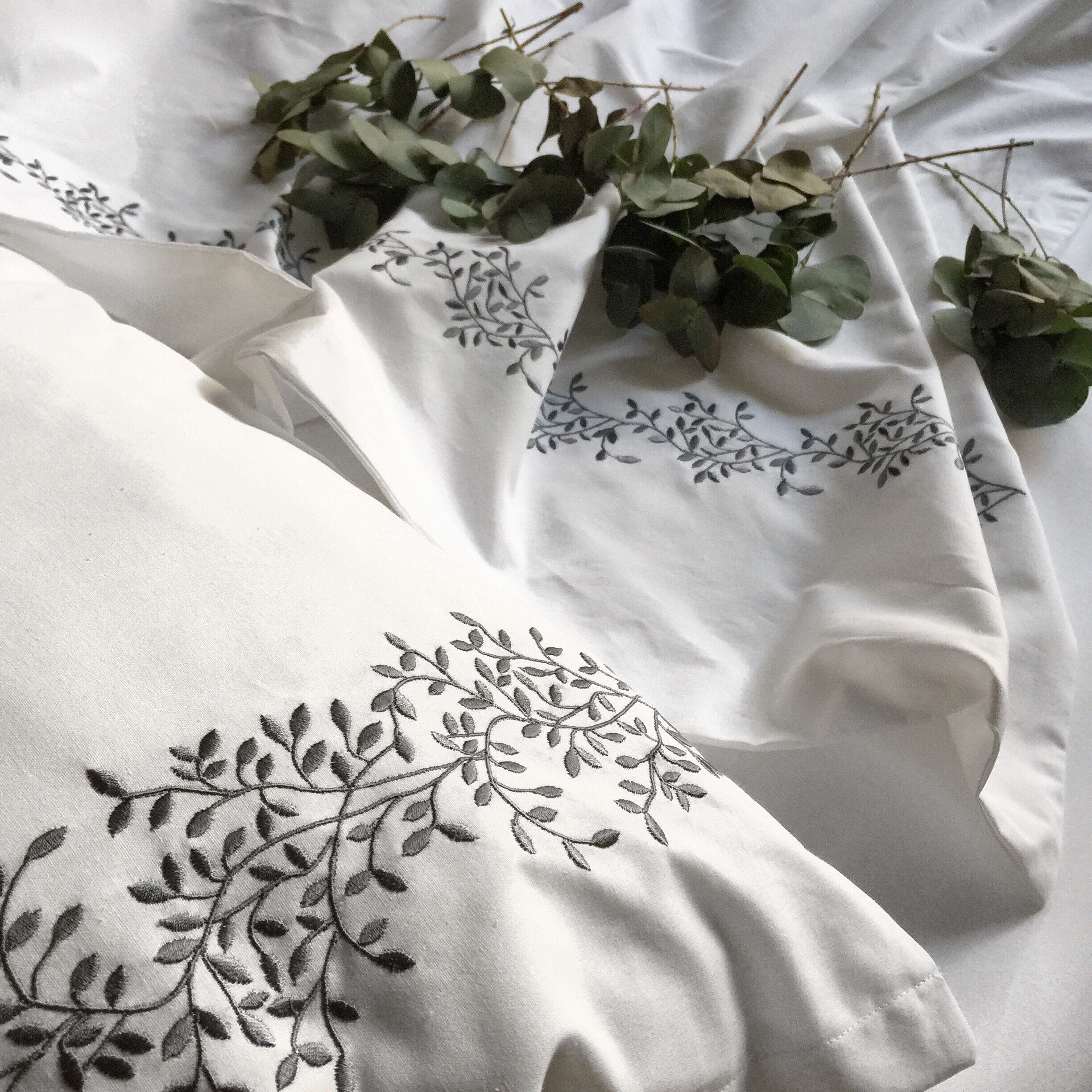 Pościel satynowa haftowana z merceryzowanej bawełny tureckiej 140 g/m² – biały z szarym haftem gałązek | Kolekcja Haftowana