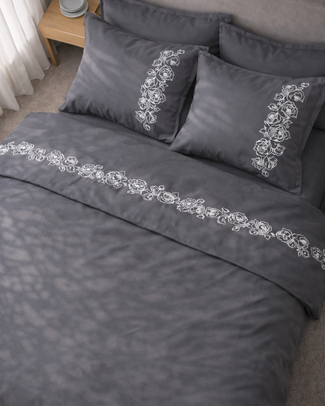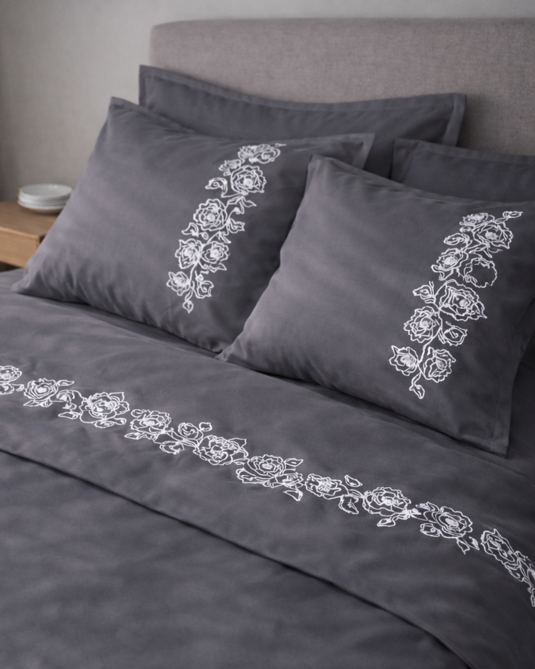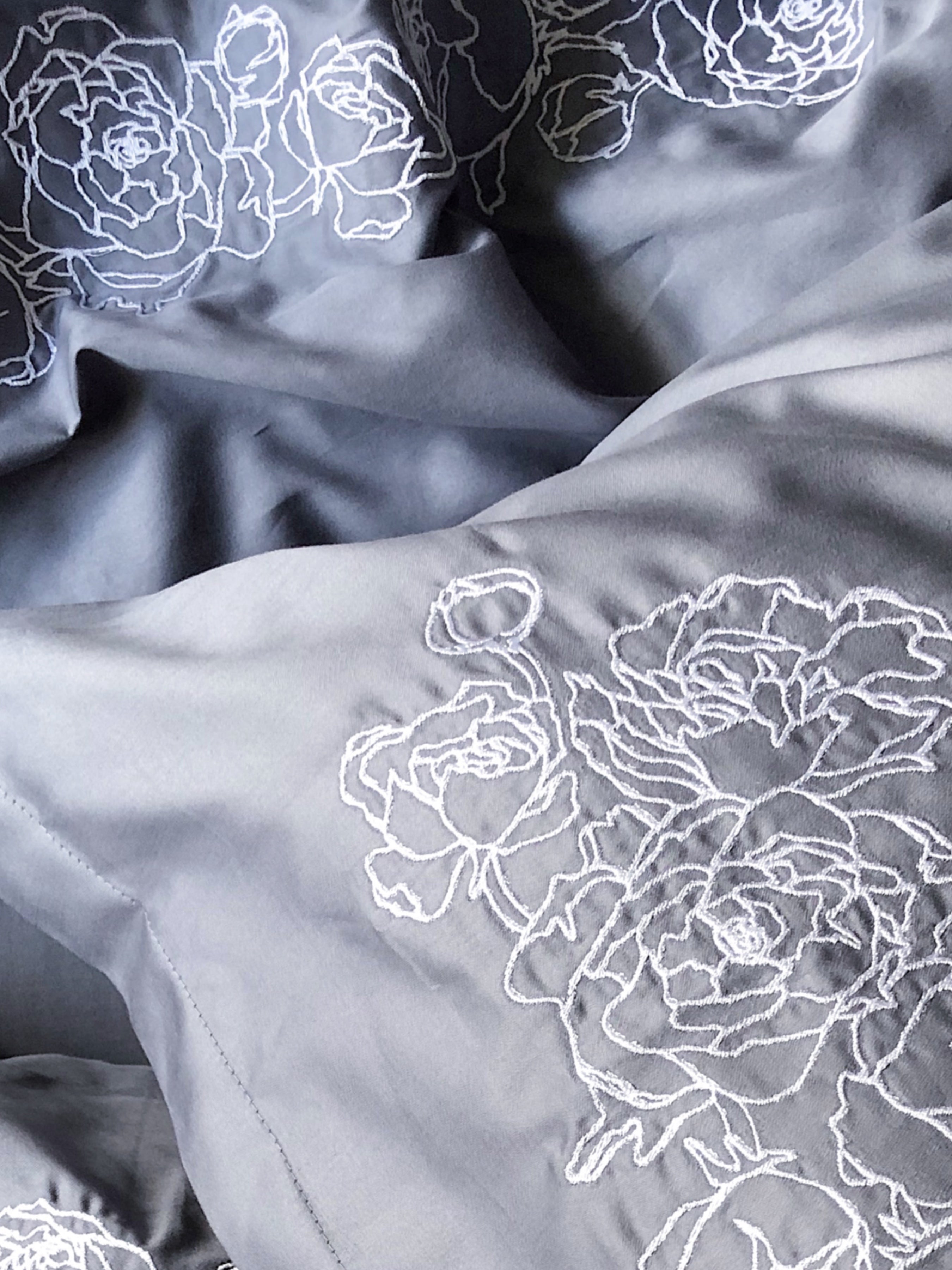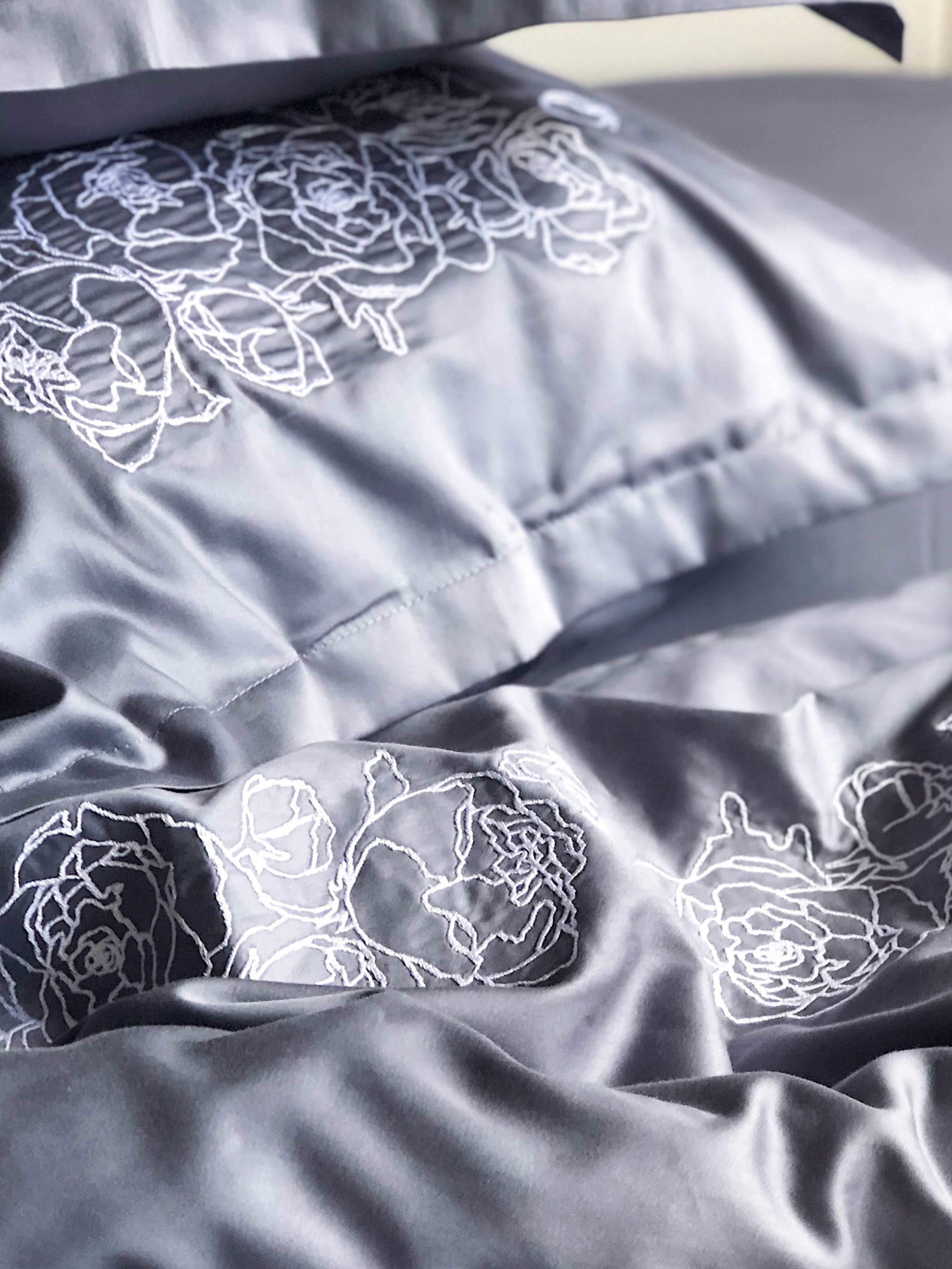 Pościel satynowa haftowana z merceryzowanej bawełny tureckiej 140 g/m² – ciemnoszara z białym haftem piwonii | Kolekcja Haftowana
