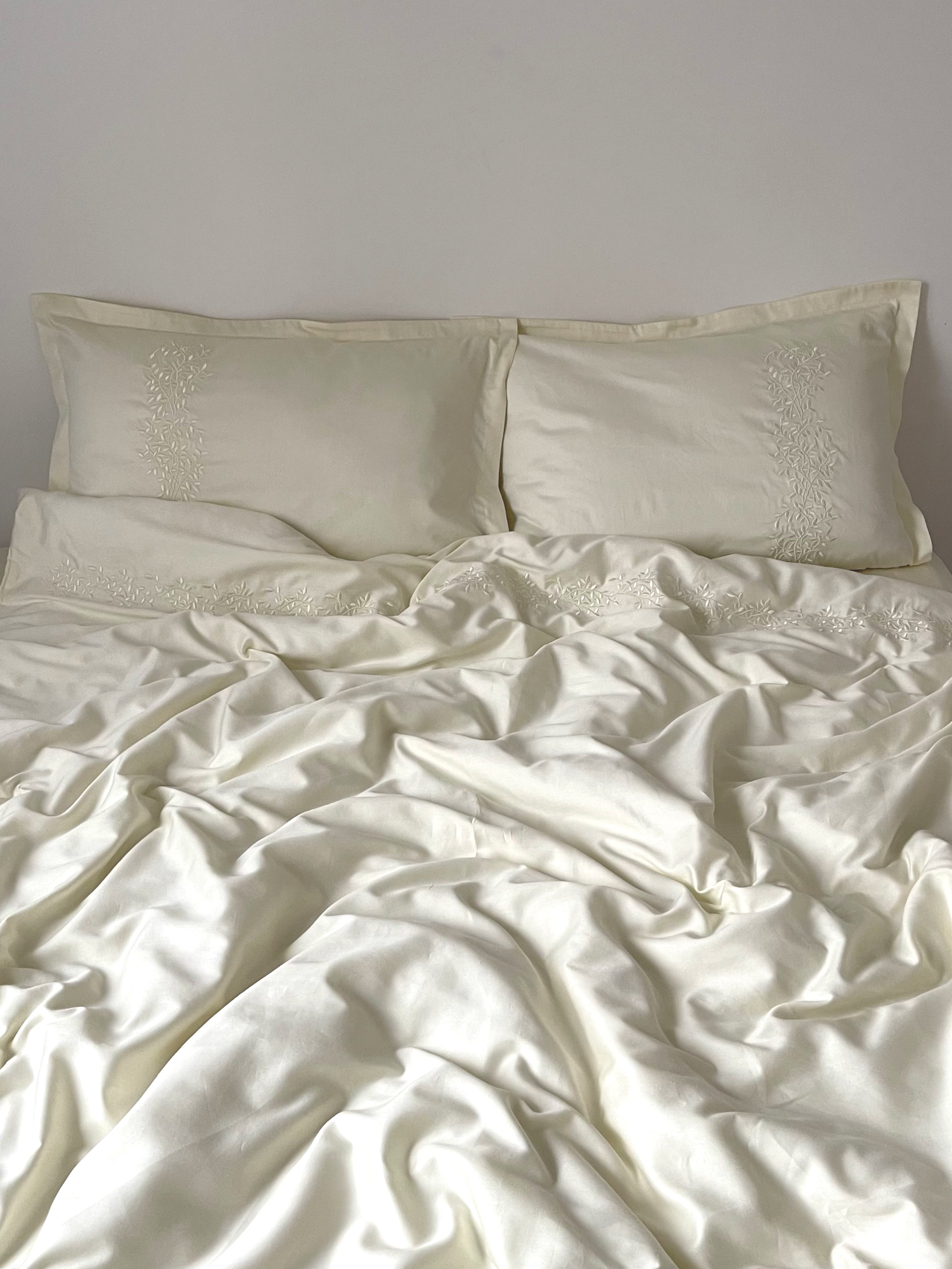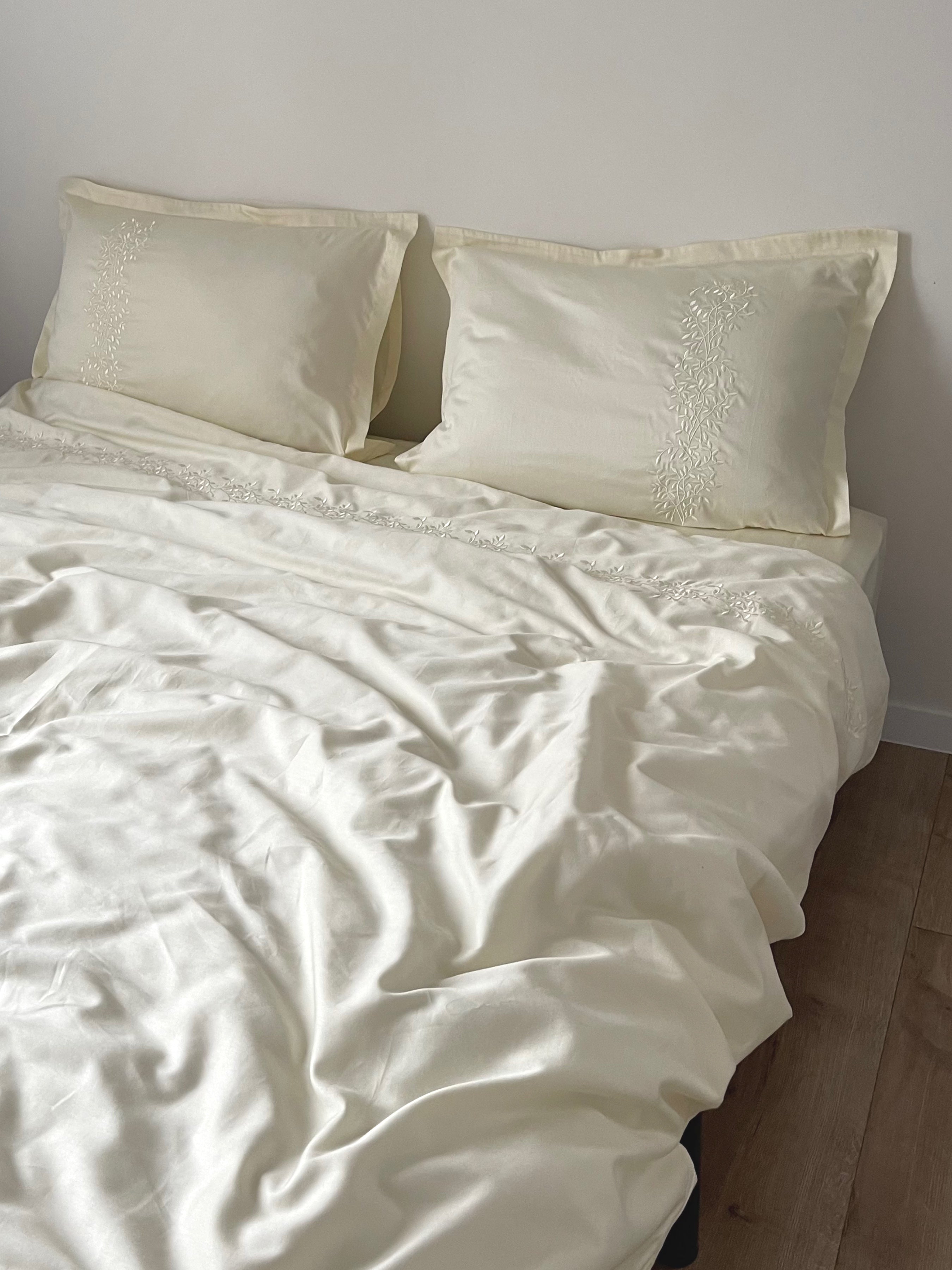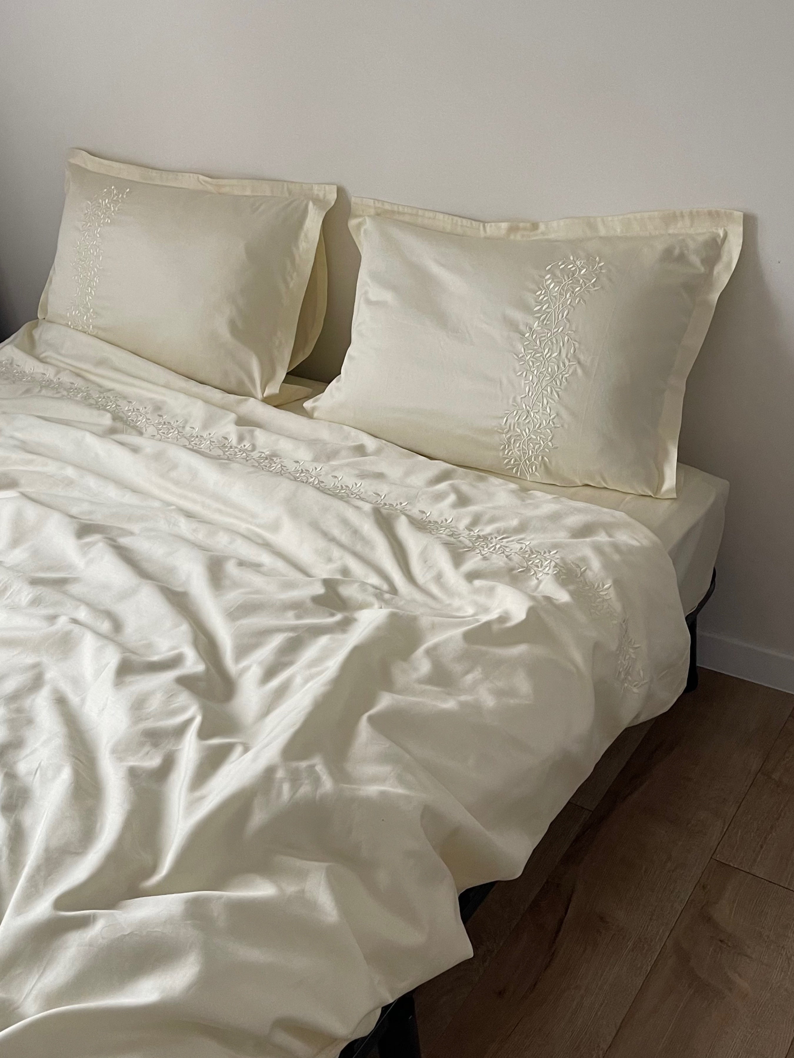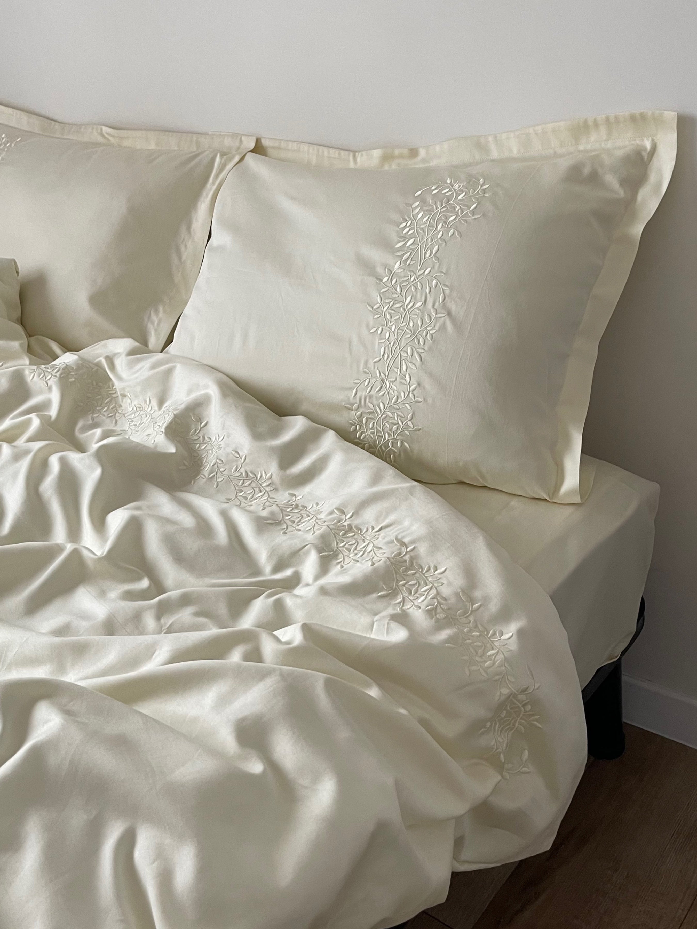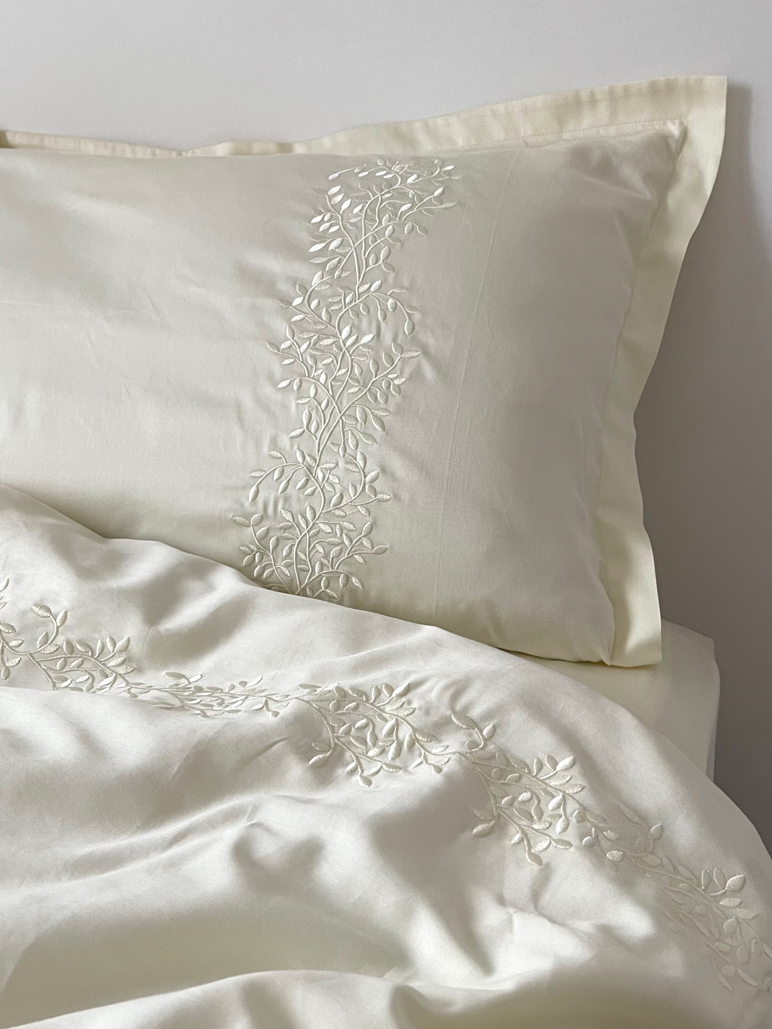 Pościel satynowa haftowana z merceryzowanej bawełny tureckiej 140 g/m² – ecru z haftem gałązek | Kolekcja Haftowana