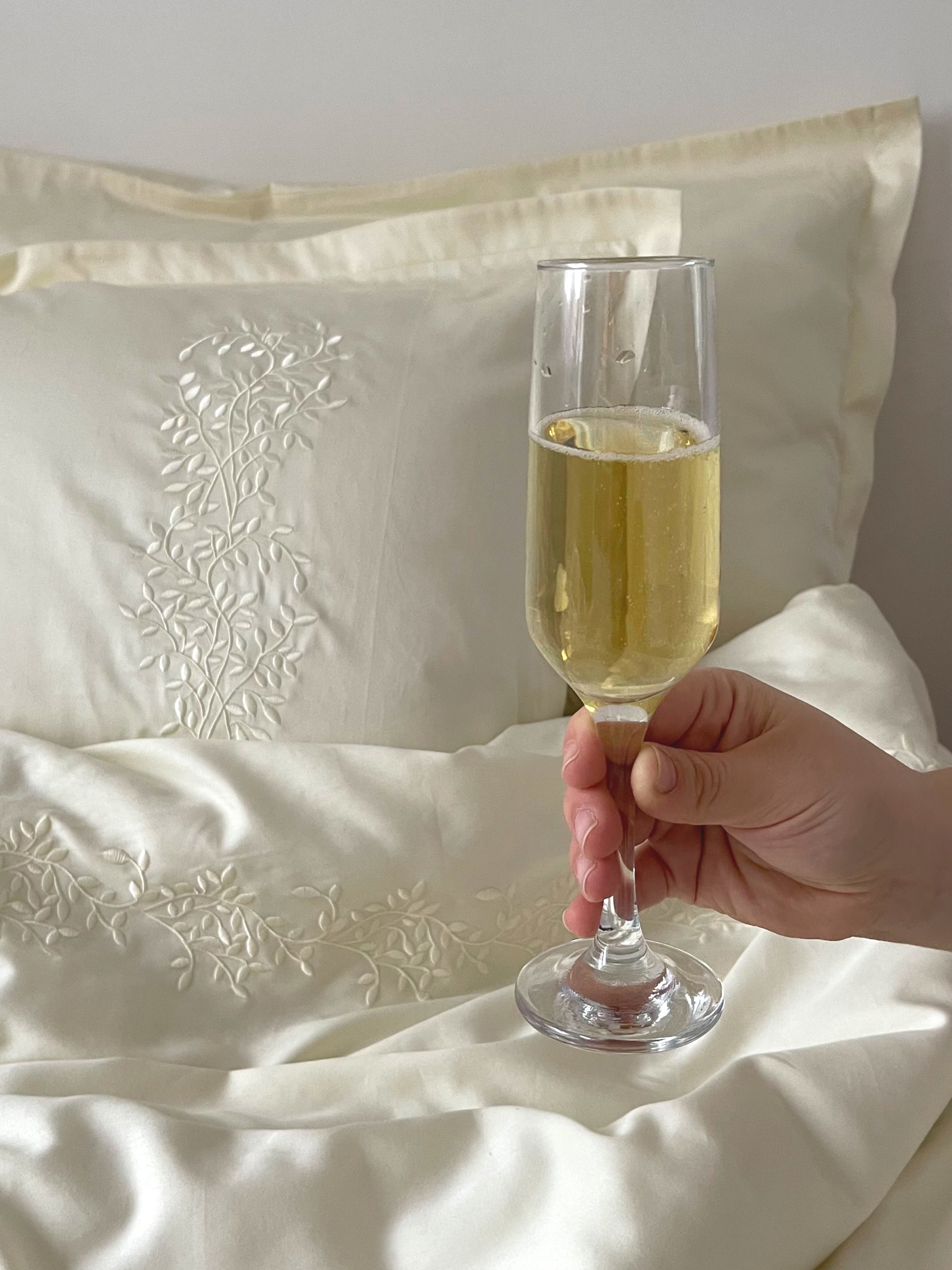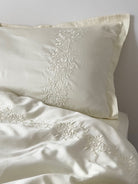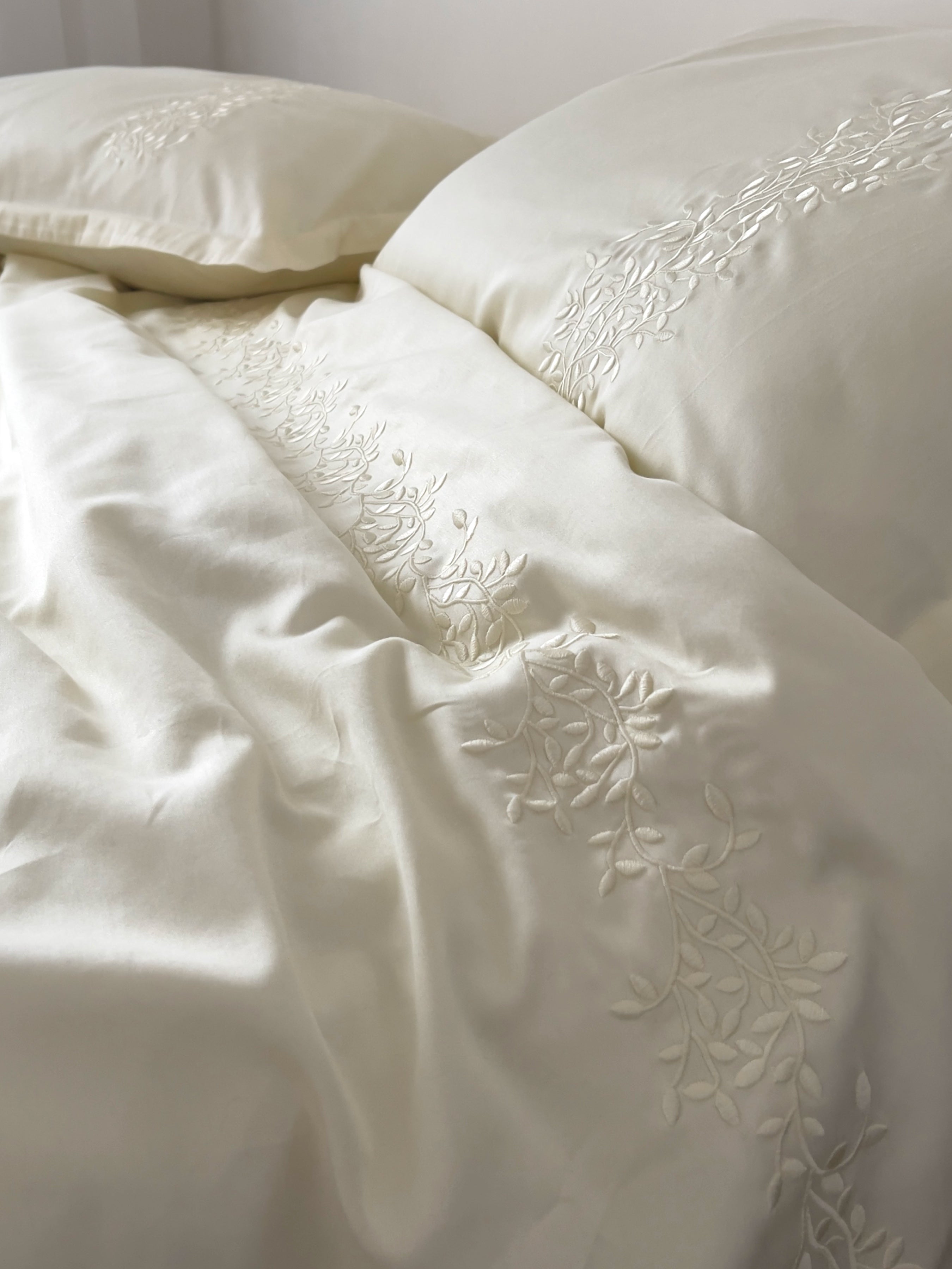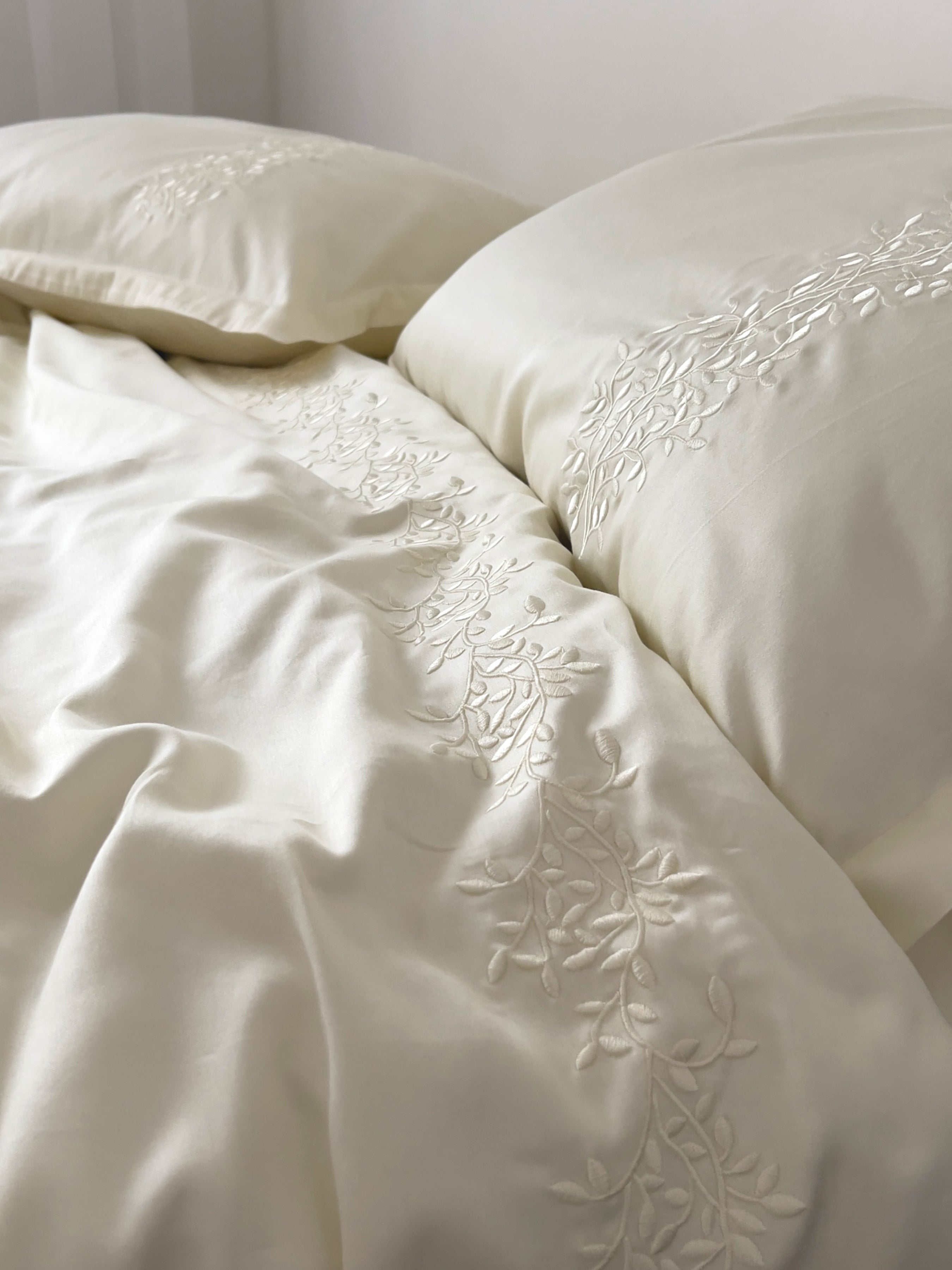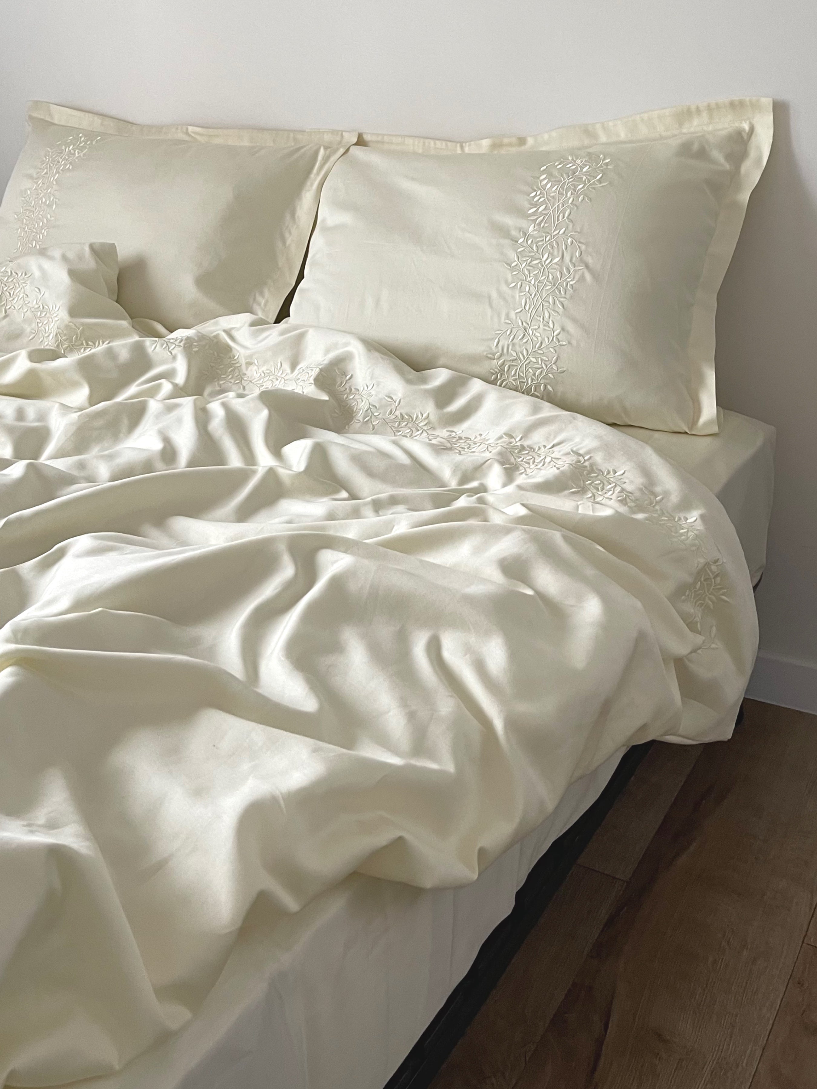 Pościel satynowa haftowana z merceryzowanej bawełny tureckiej 140 g/m² – ecru z haftem gałązek | Kolekcja Haftowana