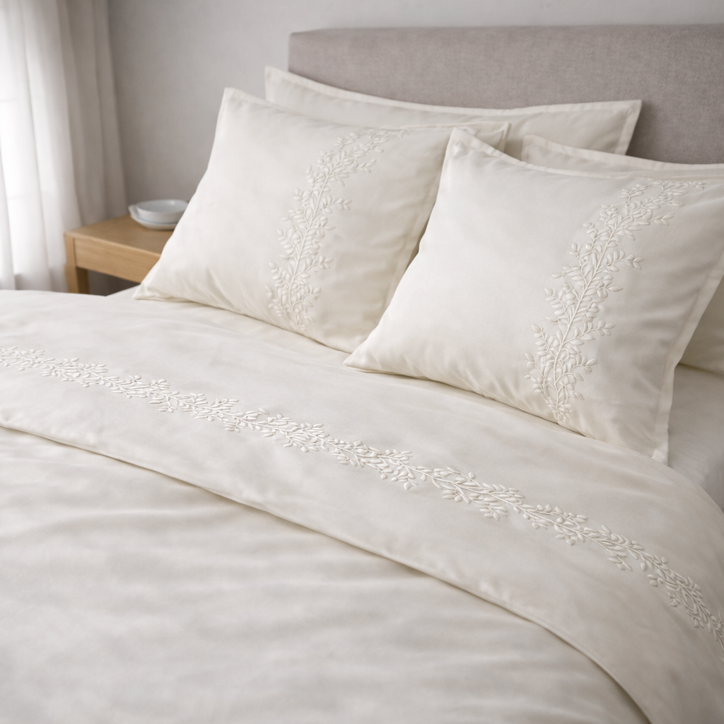 Pościel z Kolekcji Haftowanej powstaje z tej samej, sprawdzonej satyny bawełnianej klasy premium, wybieranej z myślą o trwałości i codziennym komforcie.