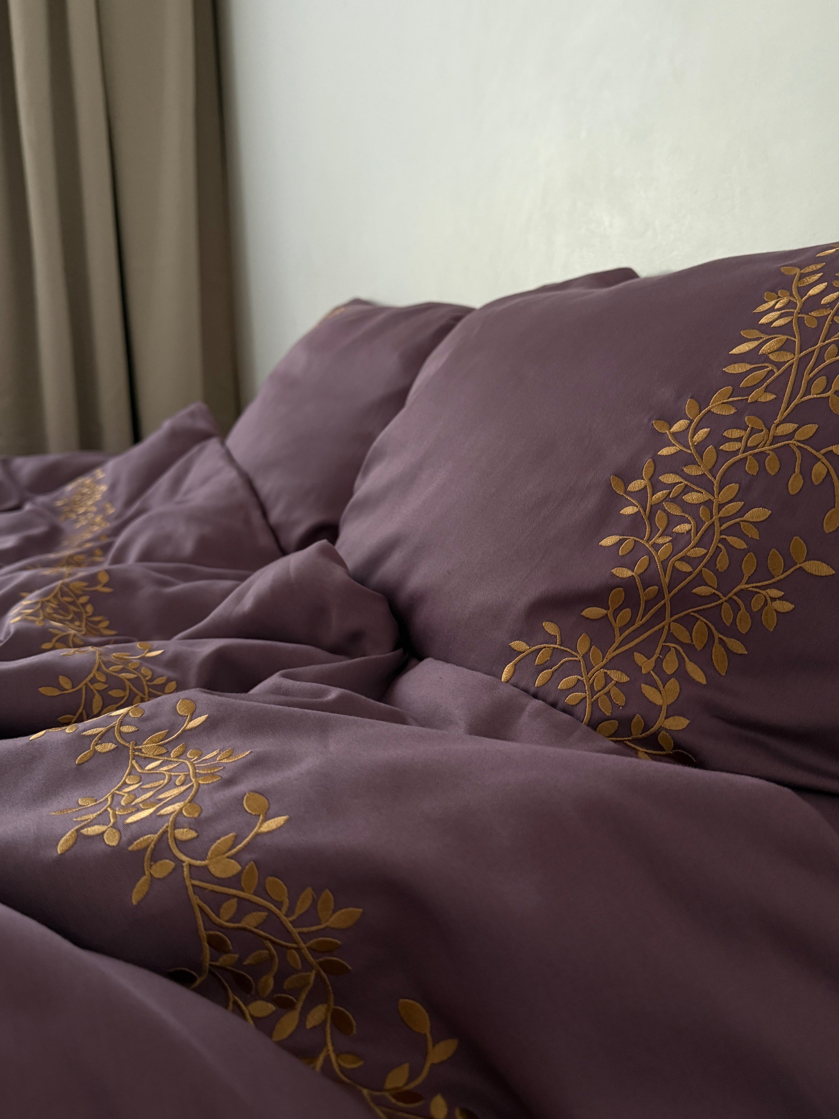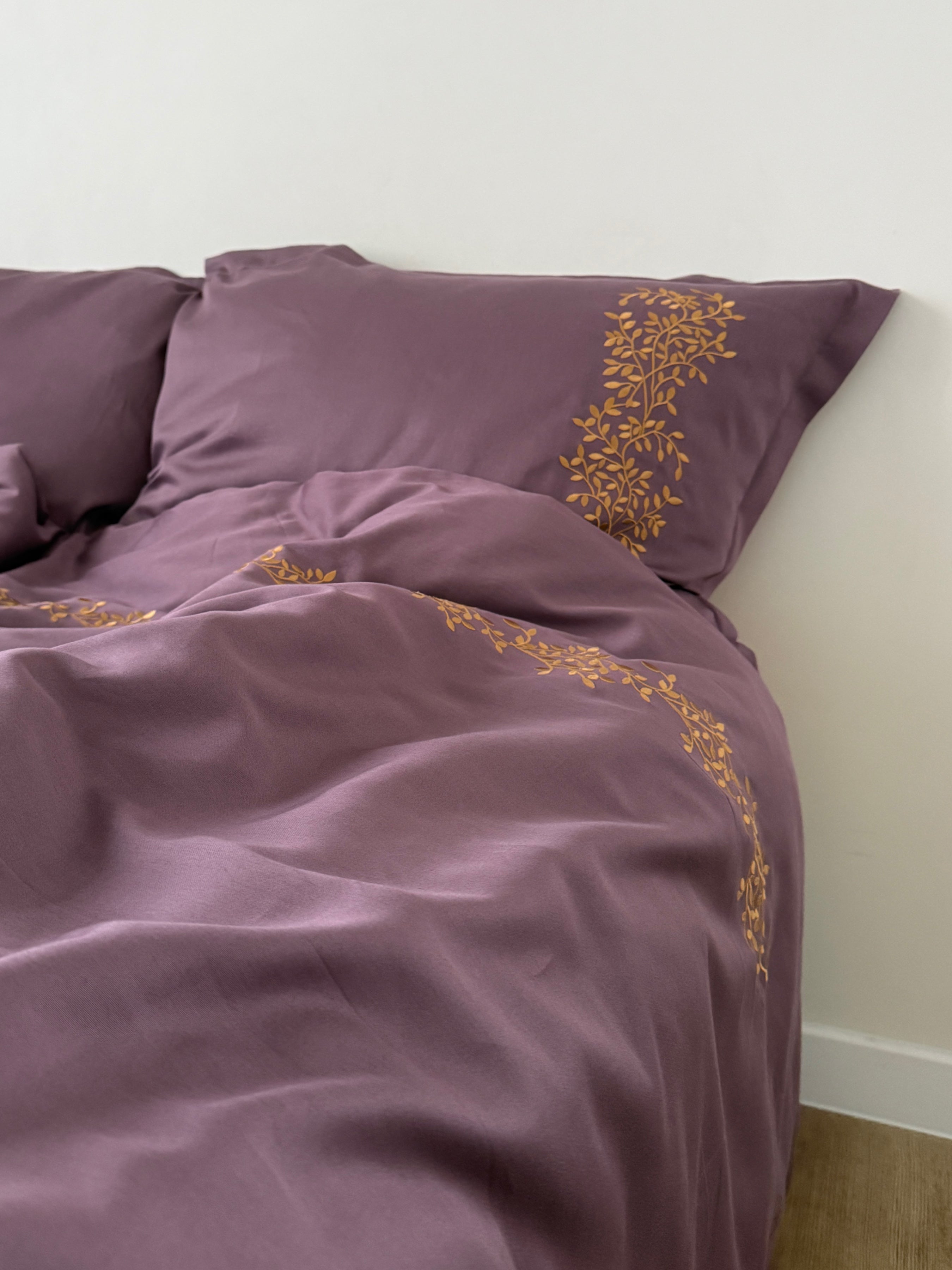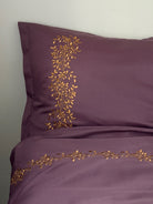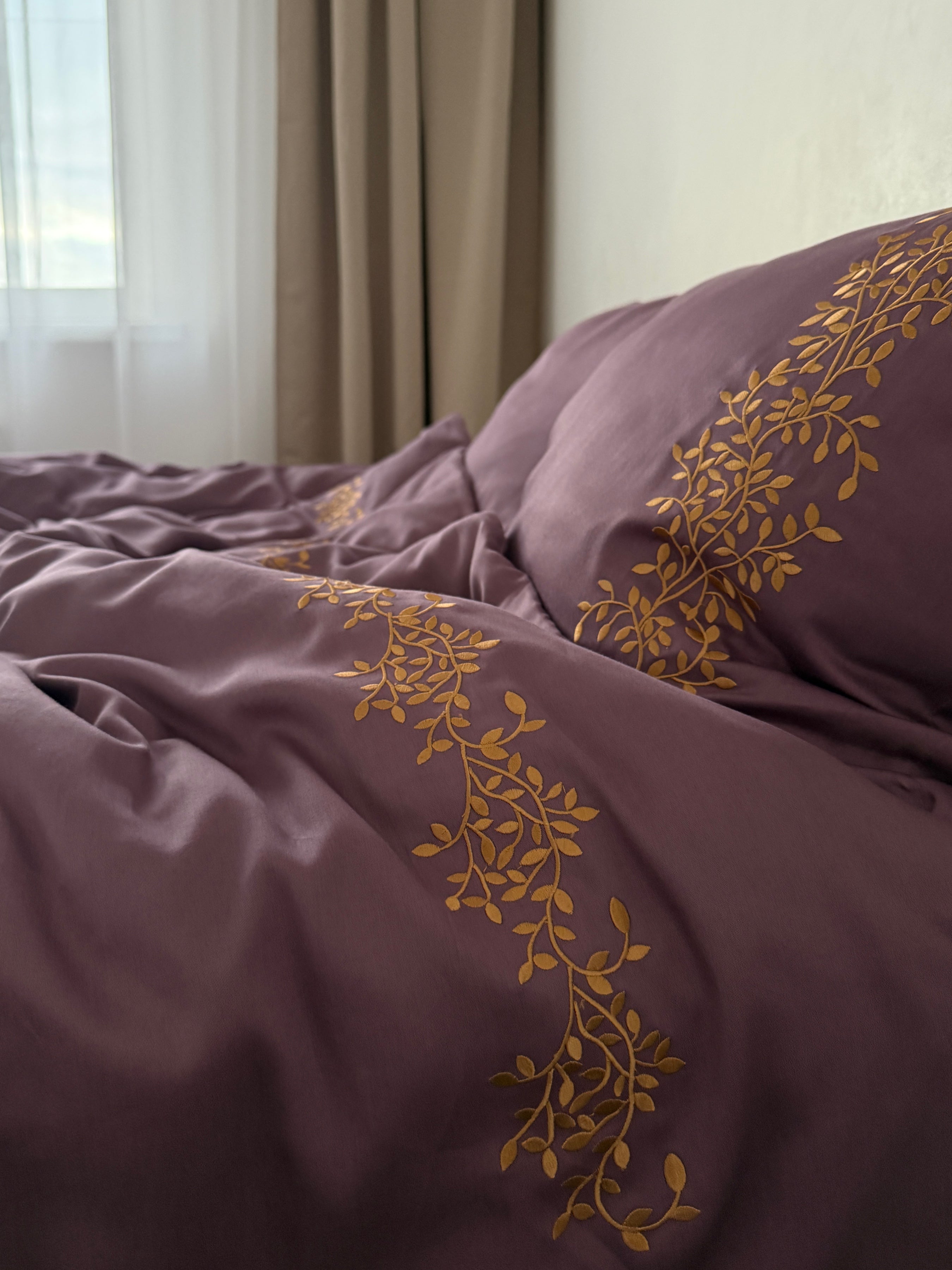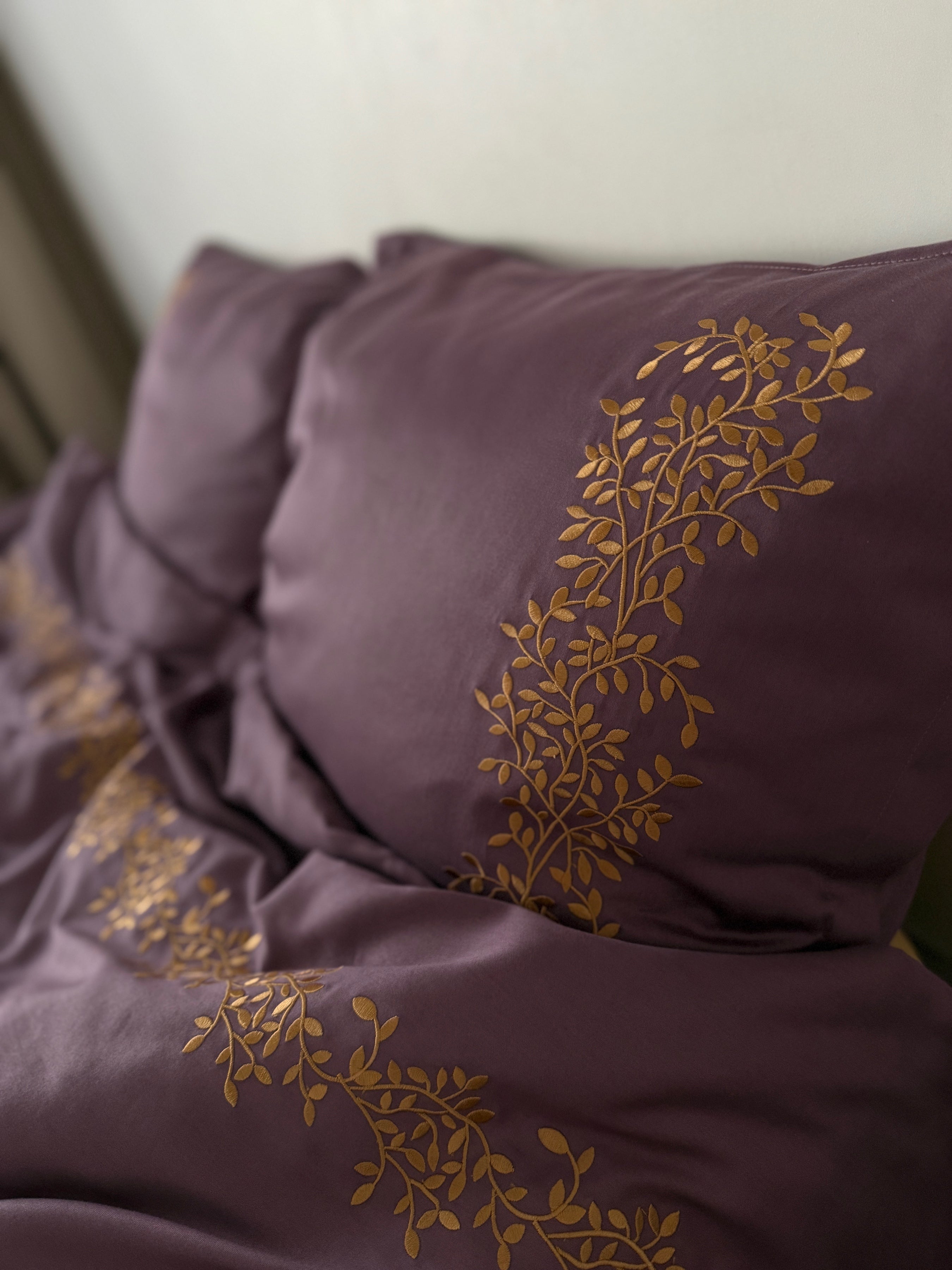 Pościel satynowa haftowana z merceryzowanej bawełny tureckiej 140 g/m² – śliwkowa z haftem gałązek | Kolekcja Haftowana