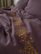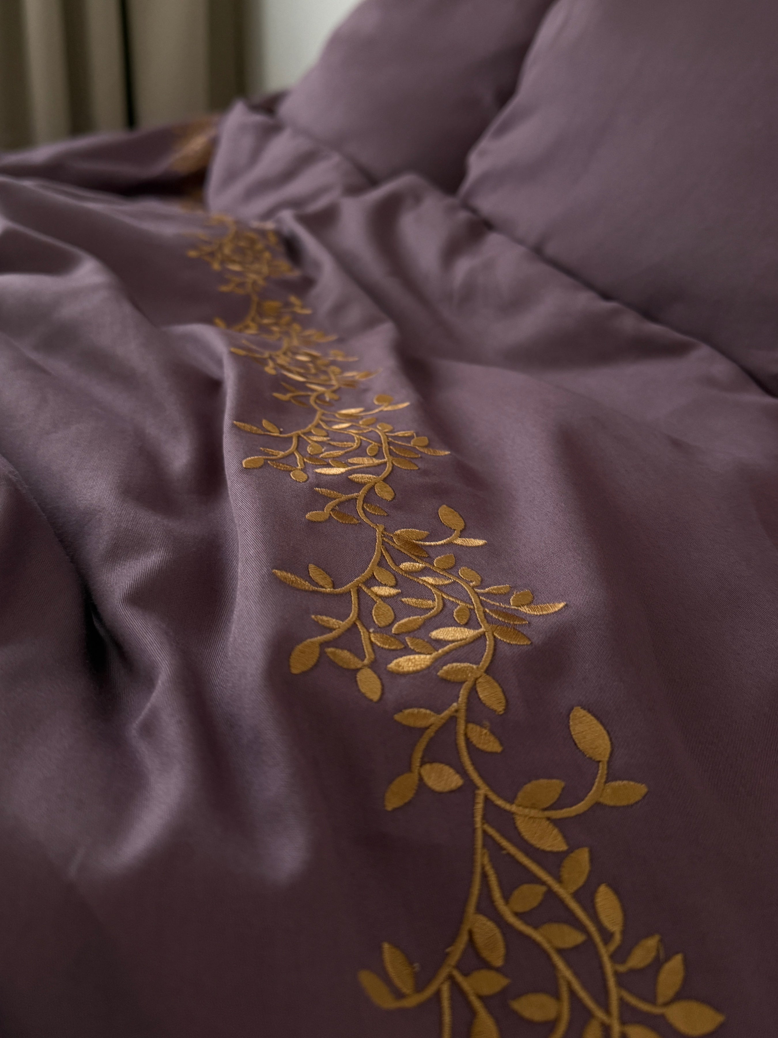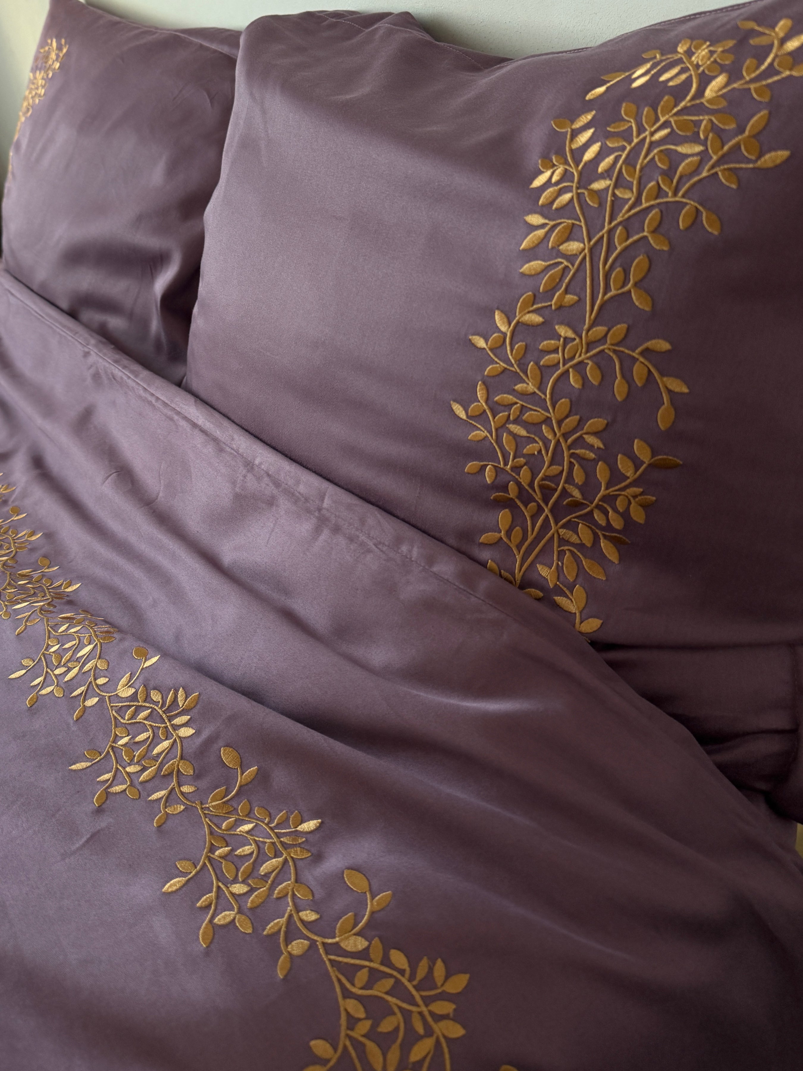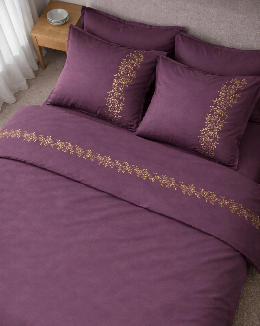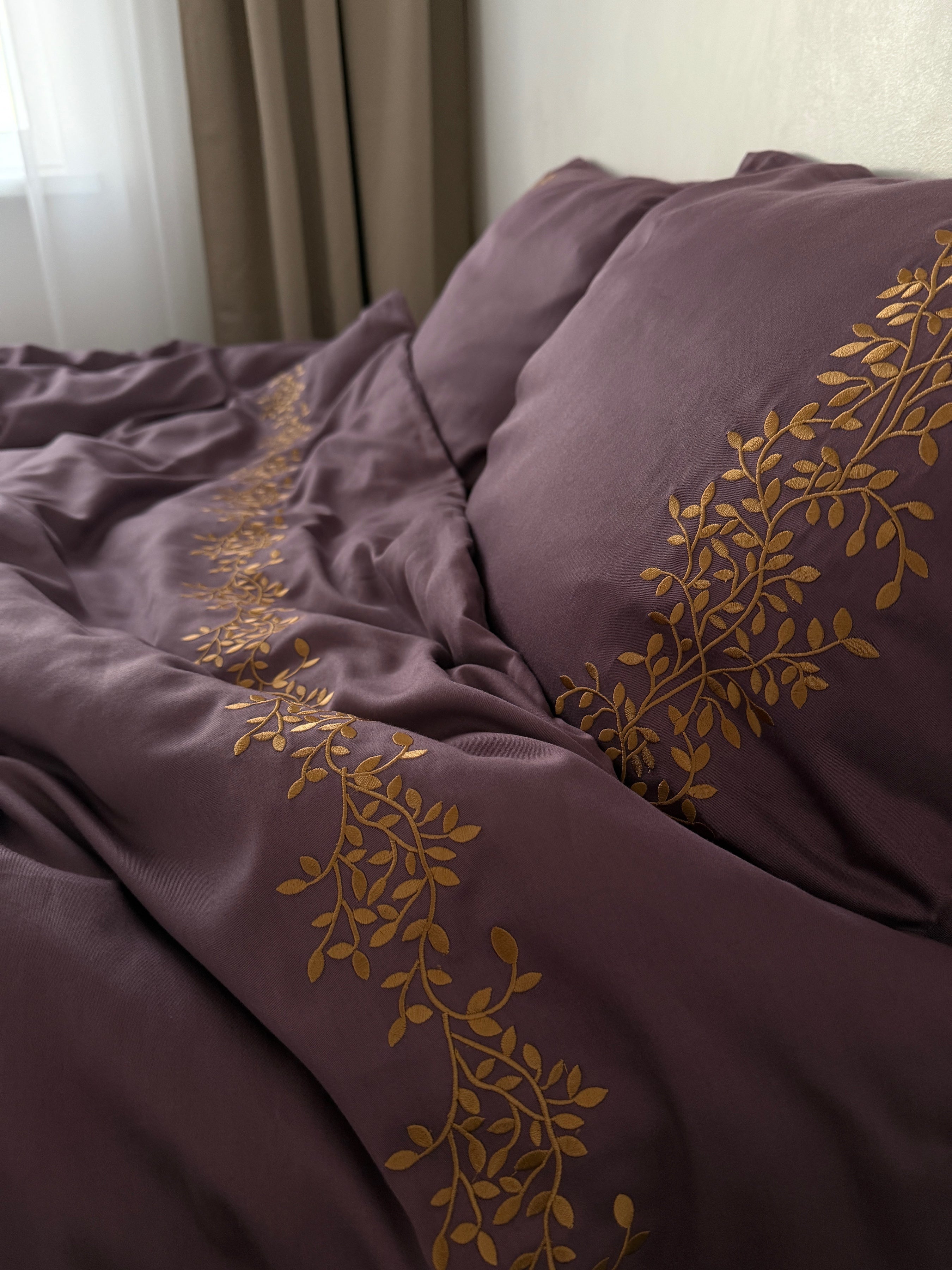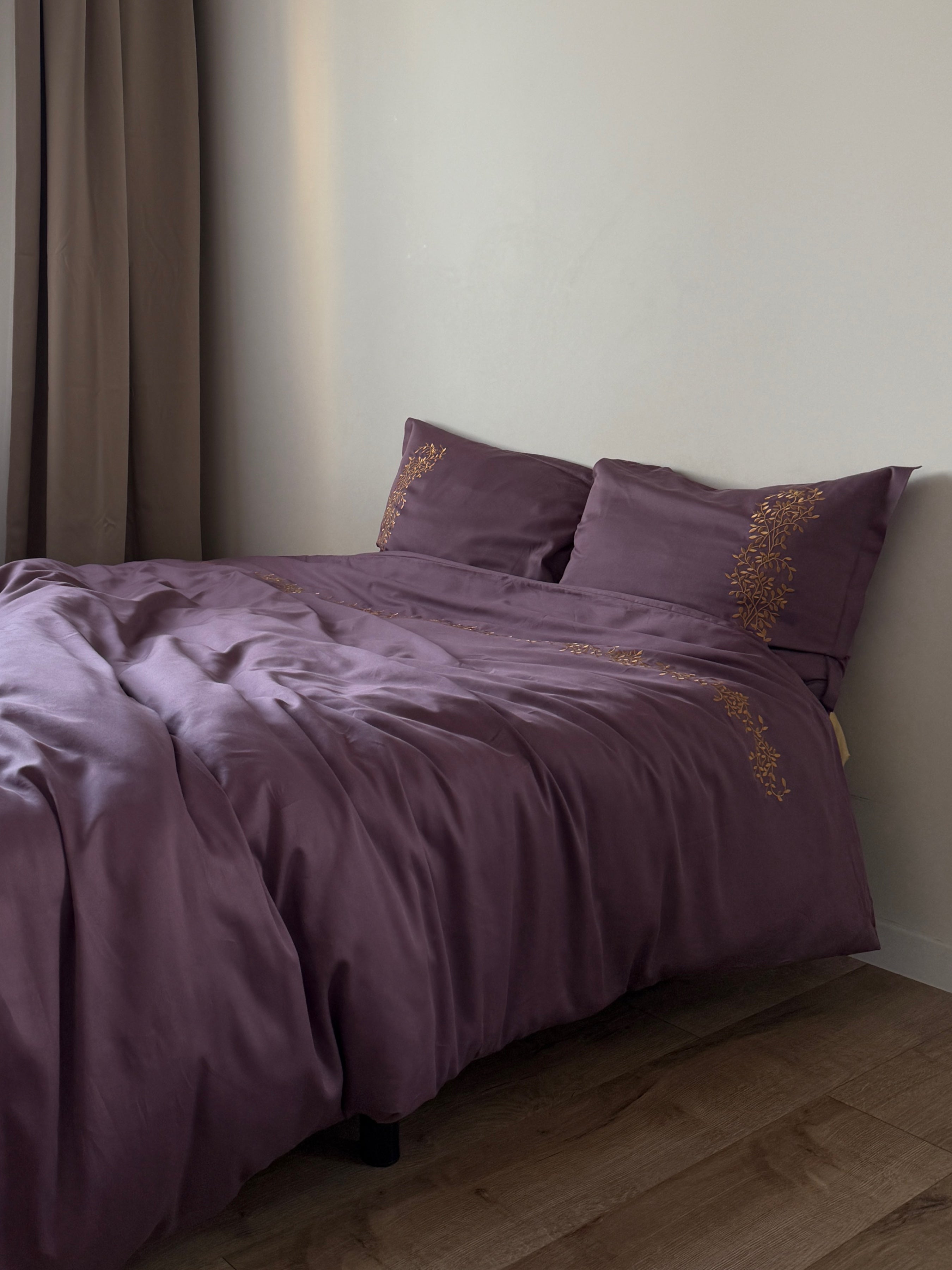 Pościel satynowa haftowana z merceryzowanej bawełny tureckiej 140 g/m² – śliwkowa z haftem gałązek | Kolekcja Haftowana