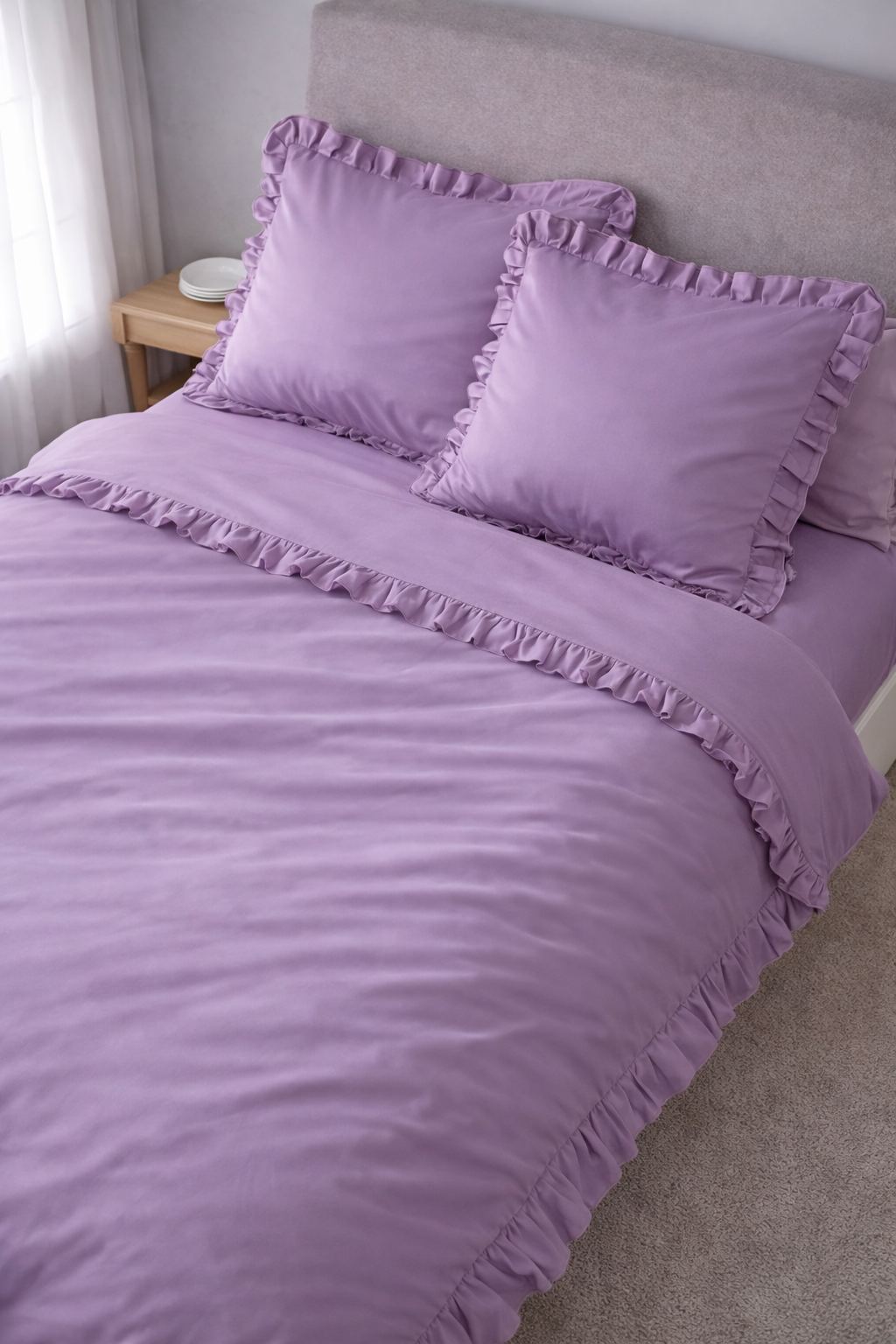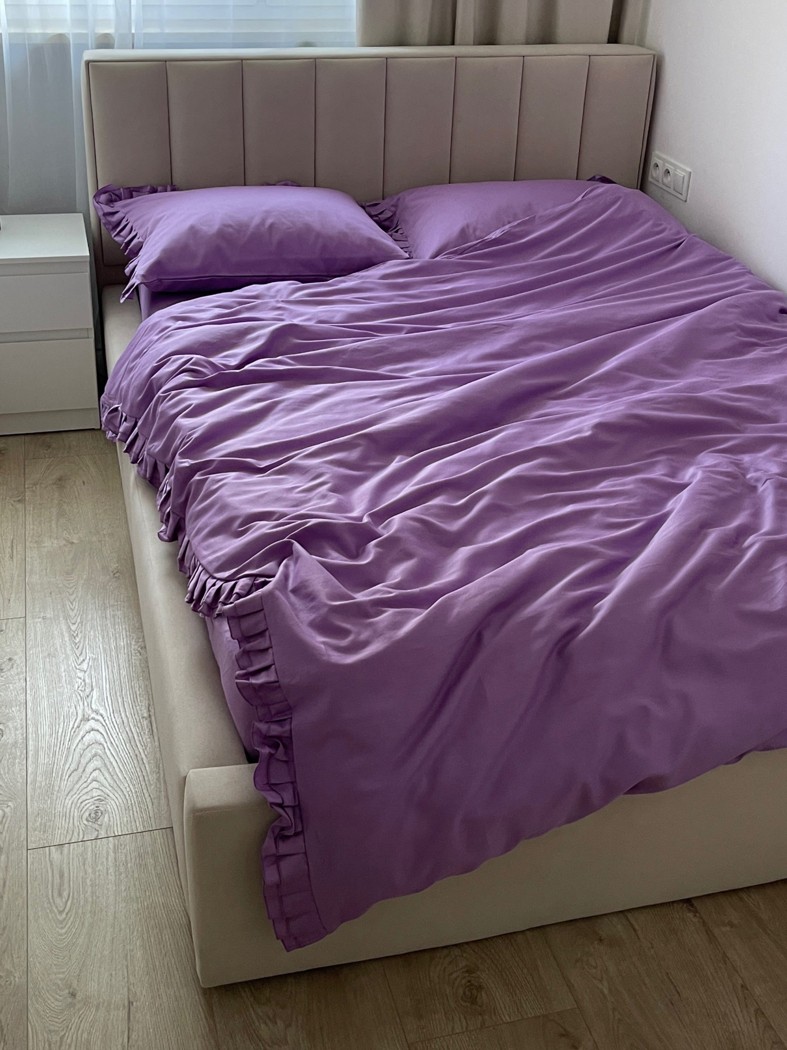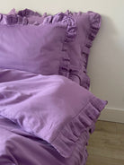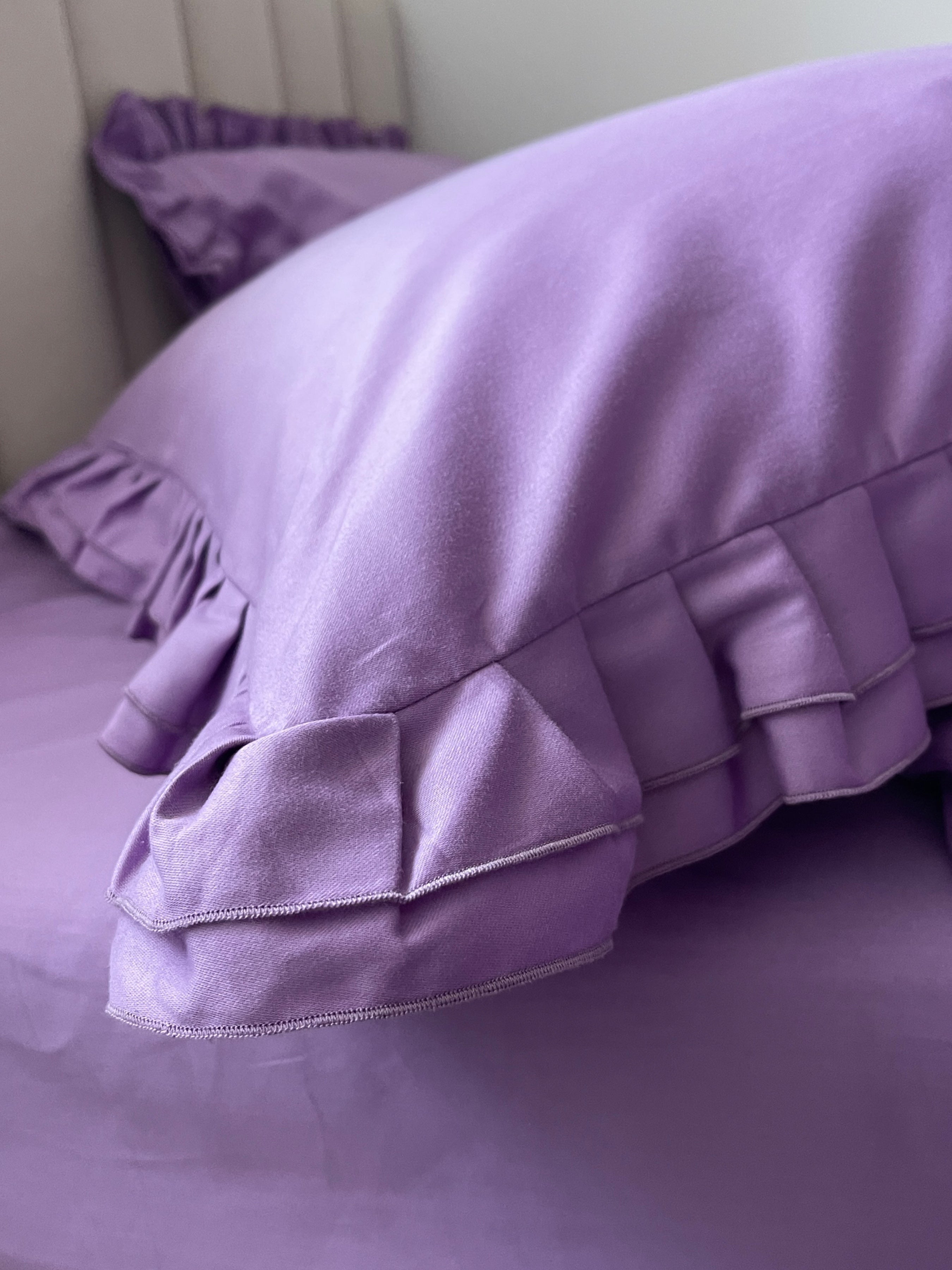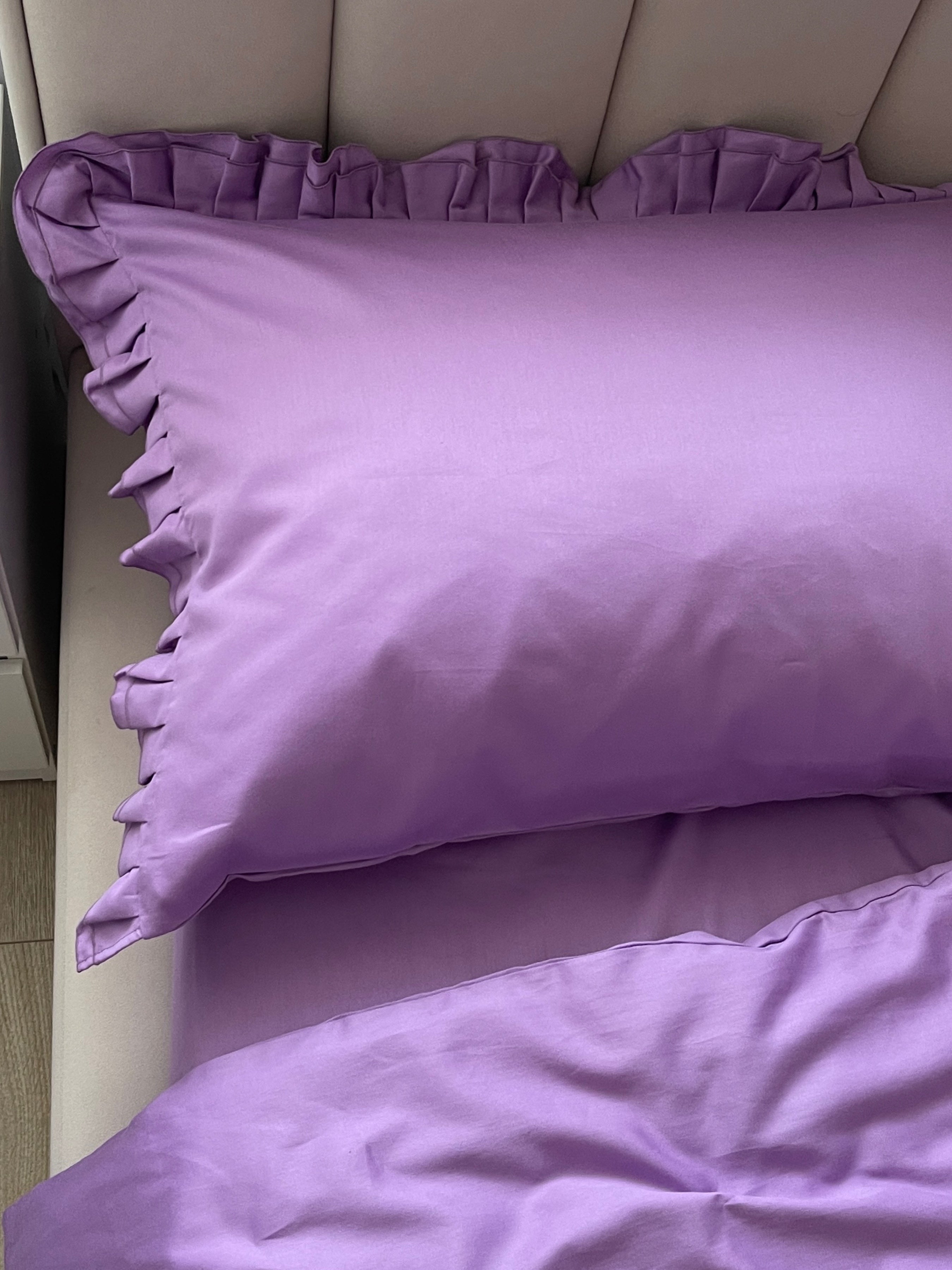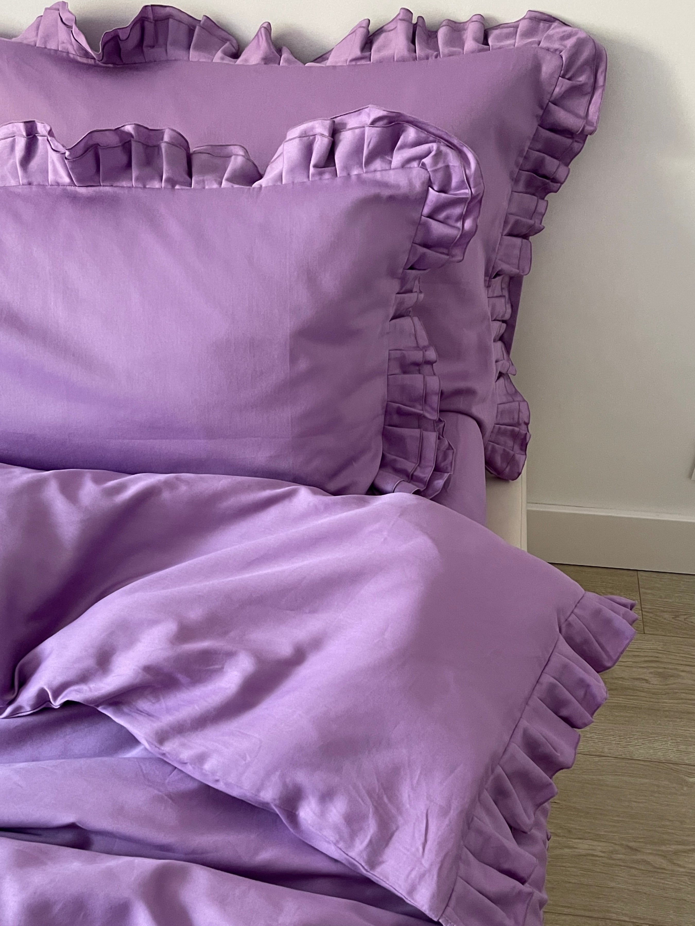 Pościel satynowa z merceryzowanej bawełny tureckiej 140 g/m² – liliowa z falbanką | Kolekcja Falbanki