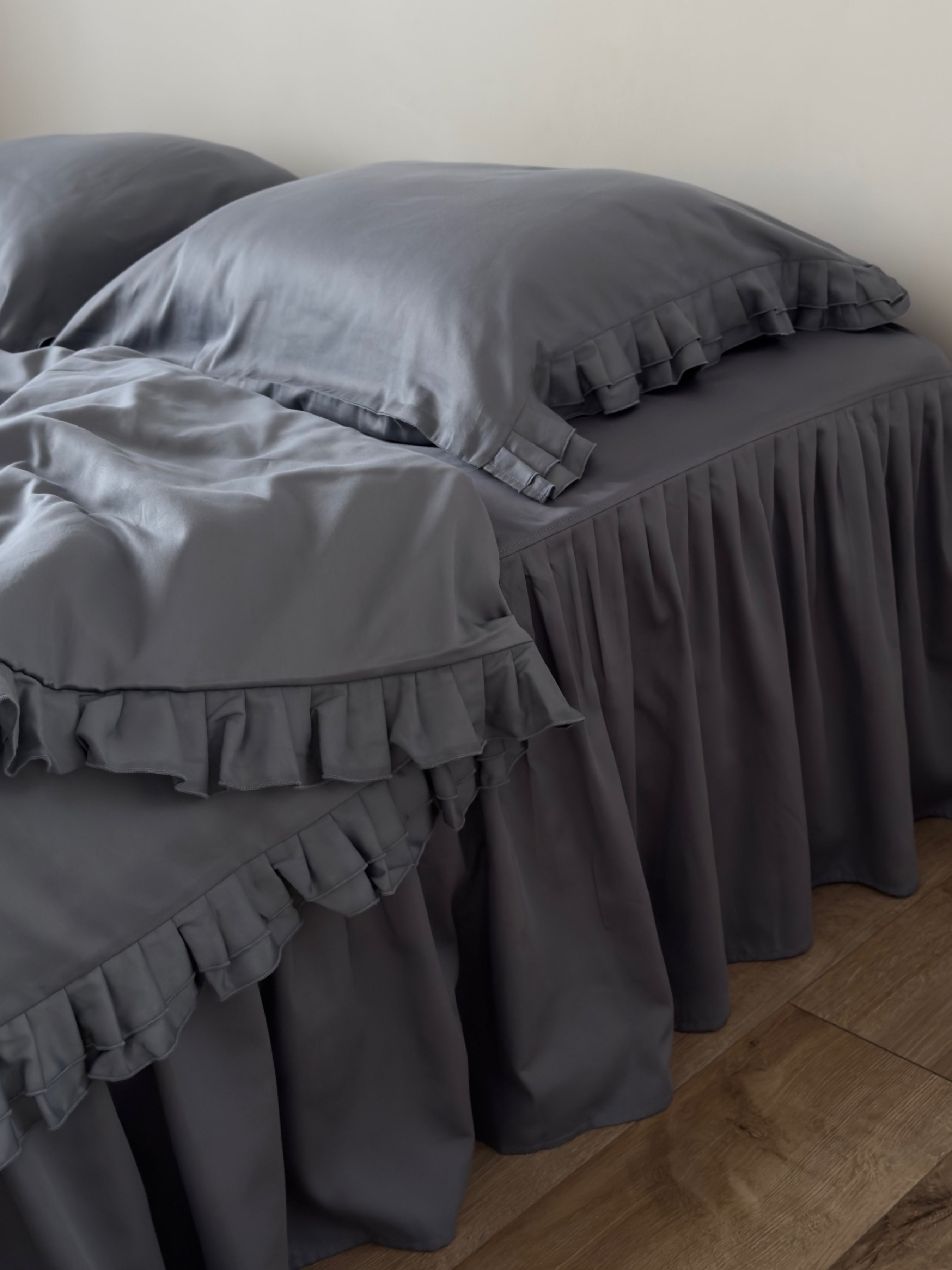 Pościel satynowa z merceryzowanej bawełny tureckiej 140 g/m² – ciemnoszara z falbanką | Kolekcja Falbanki