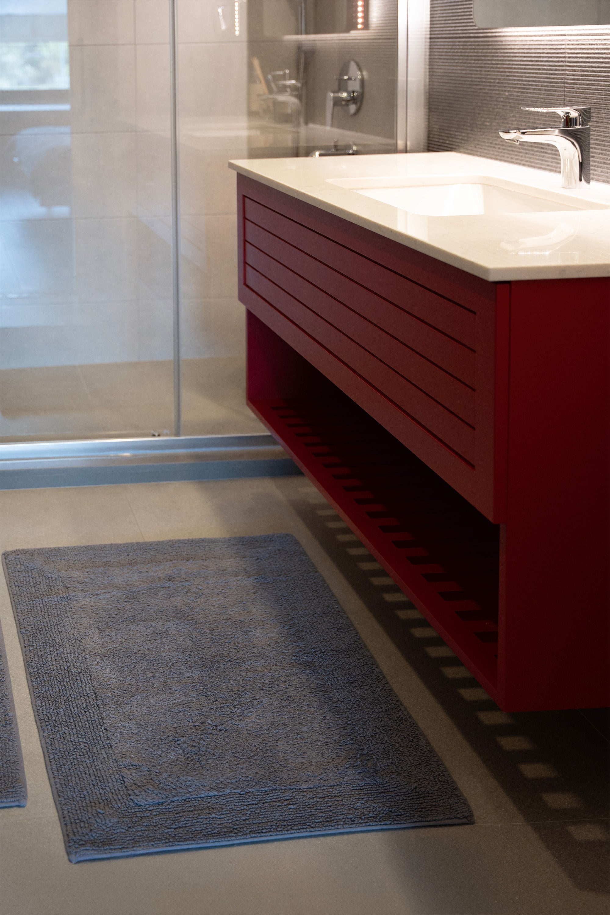 Dzięki trwałej strukturze przędzy z czesanej bawełny, Petra gwarantuje długowieczność, a naturalne włókna zapewniają miękkość i komfort przy kontakcie z gołą stopą. Wysoka chłonność sprawia, że dywaniki szybko wchłaniają wodę i błyskawicznie schną, oferując świeżość i higienę każdego dnia.
