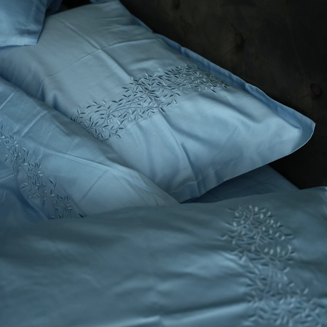 Pościel satynowa haftowana z merceryzowanej bawełny tureckiej 140 g/m² – błękitna z haftem gałązek | Kolekcja Haftowana