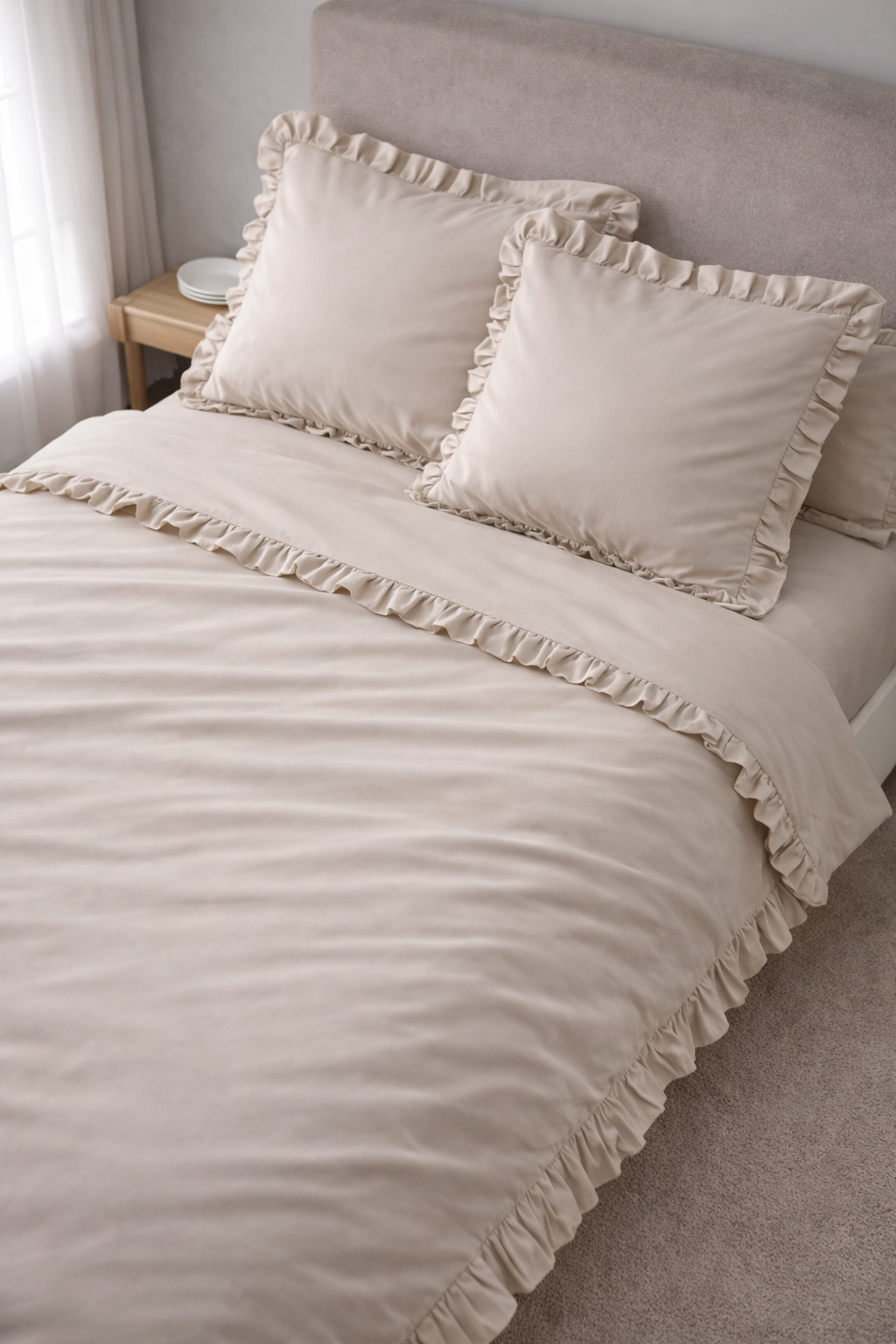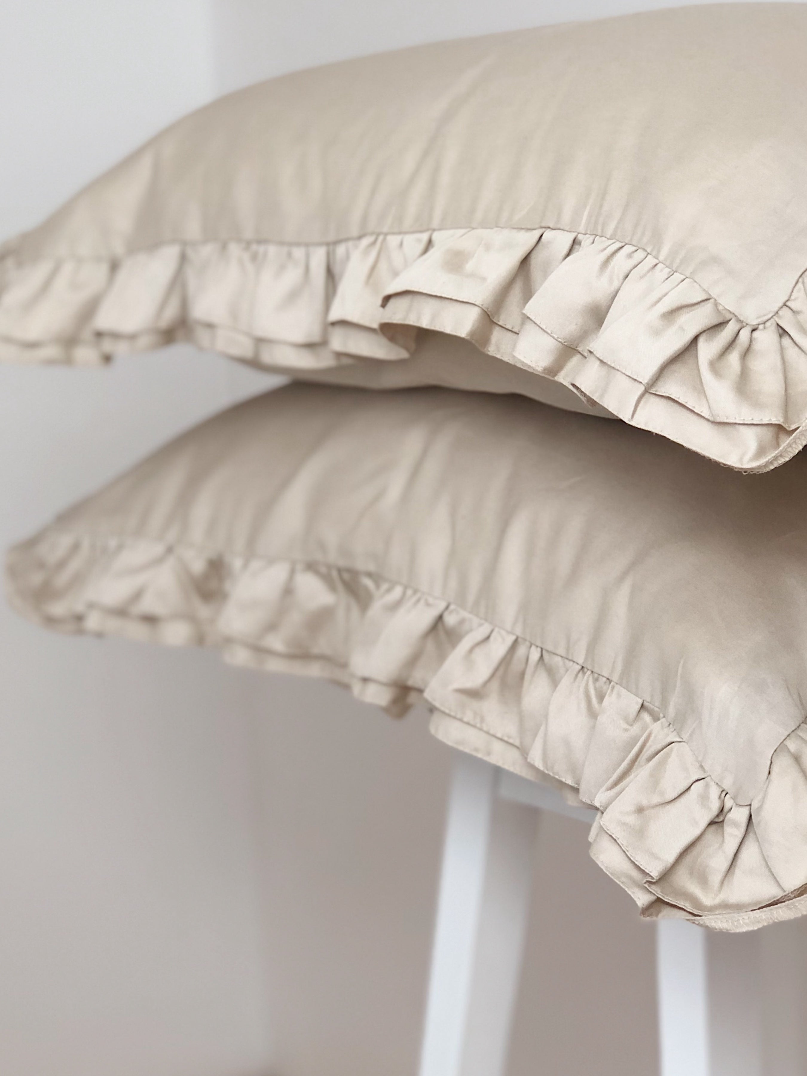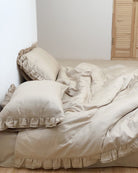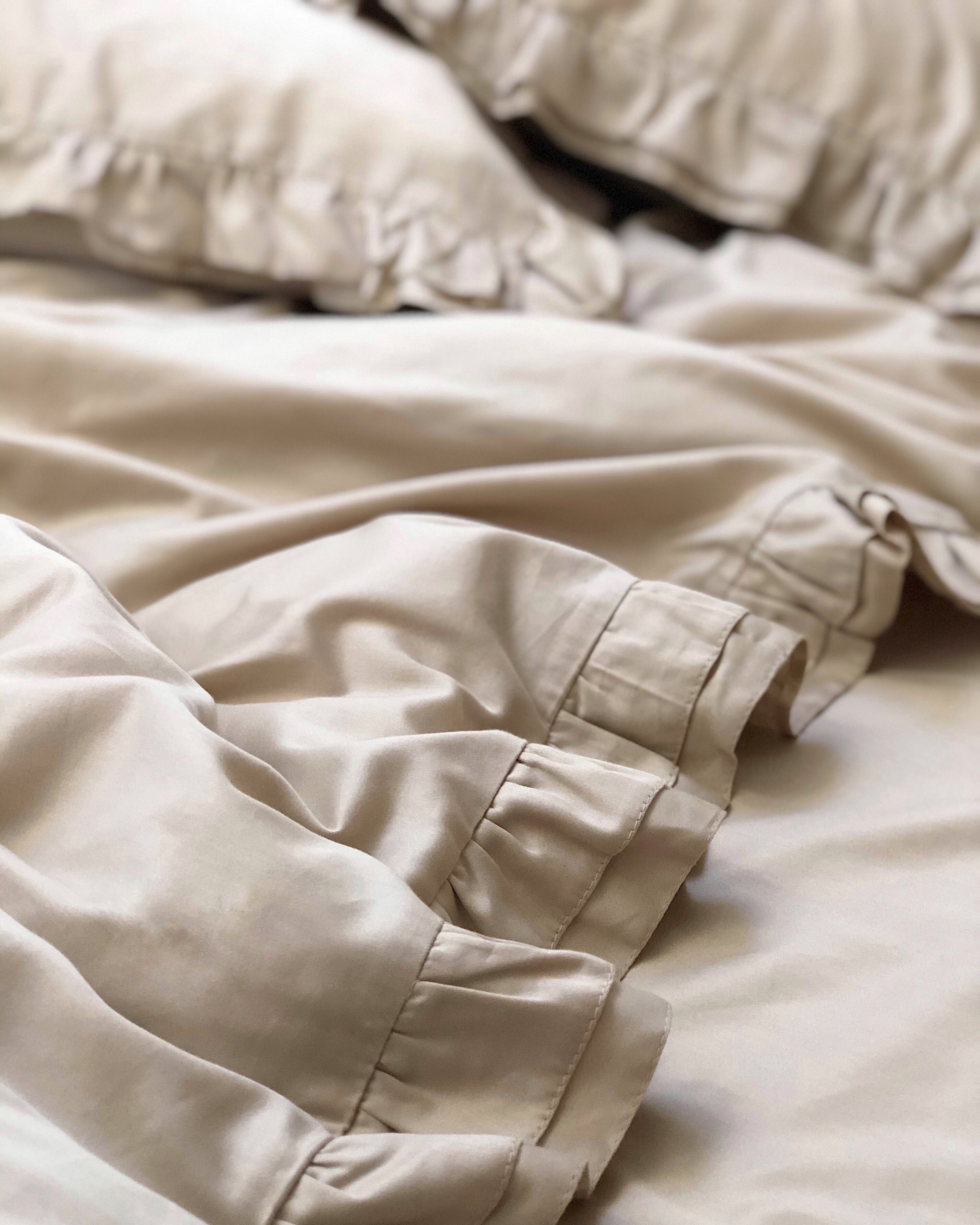 Pościel satynowa z merceryzowanej bawełny tureckiej 140 g/m² – beżowy latte z falbanką | Kolekcja Falbanki