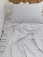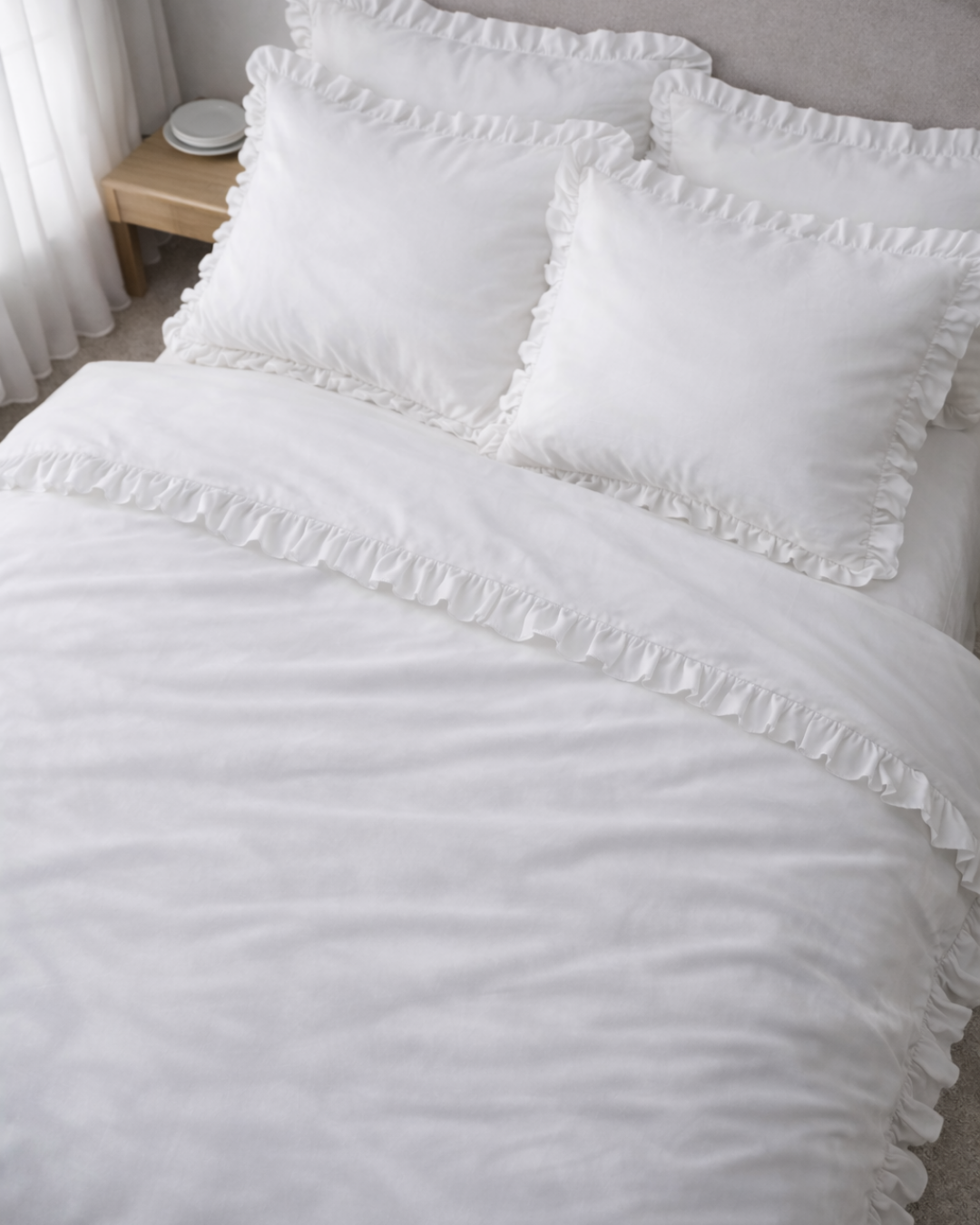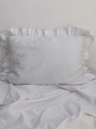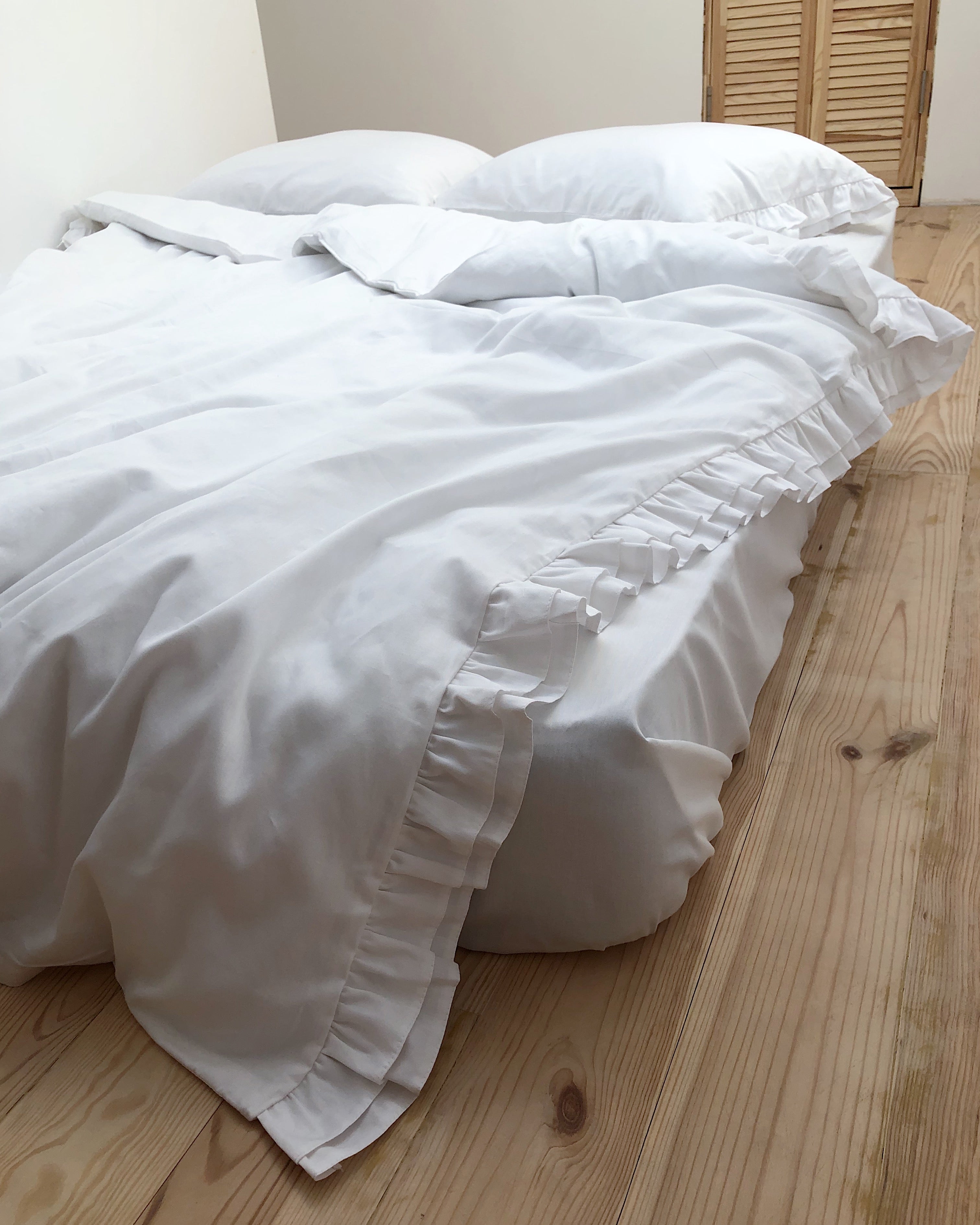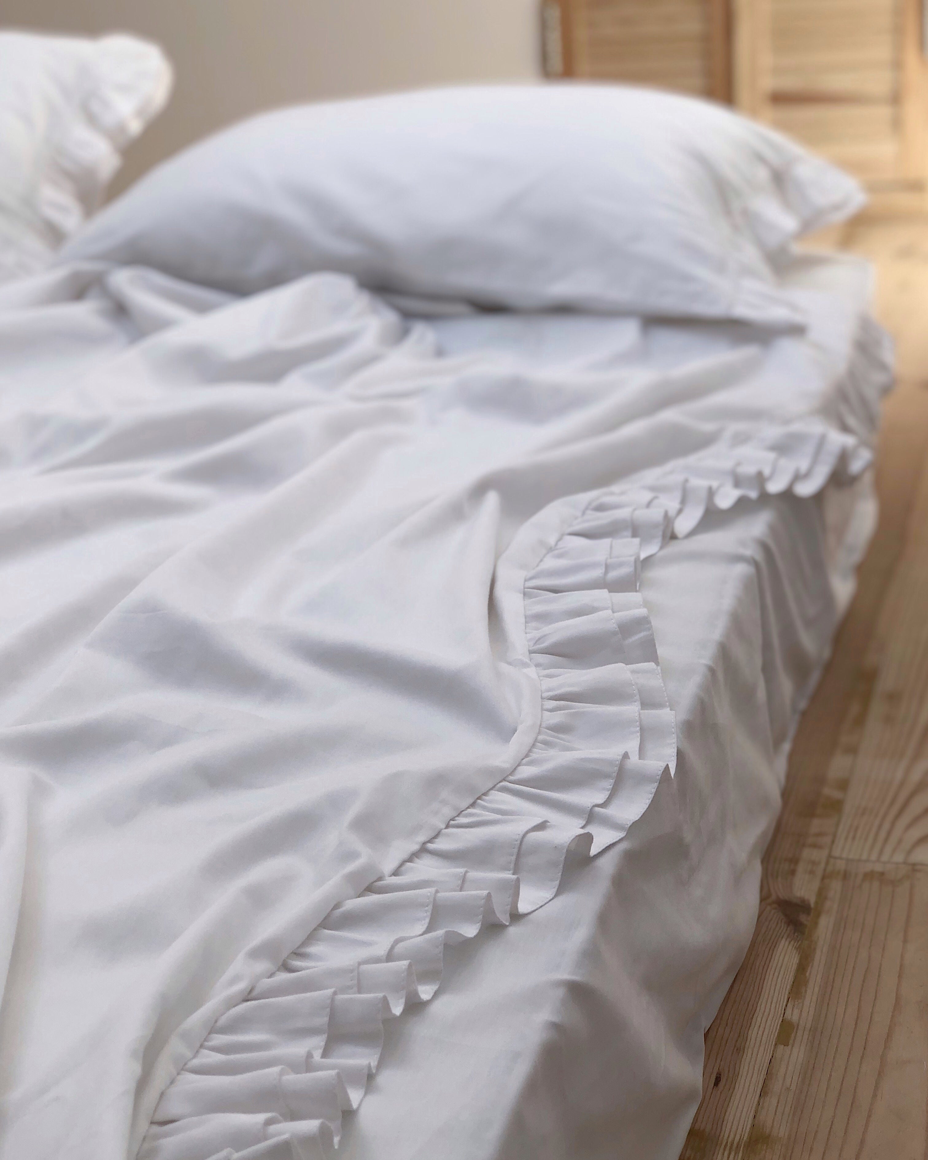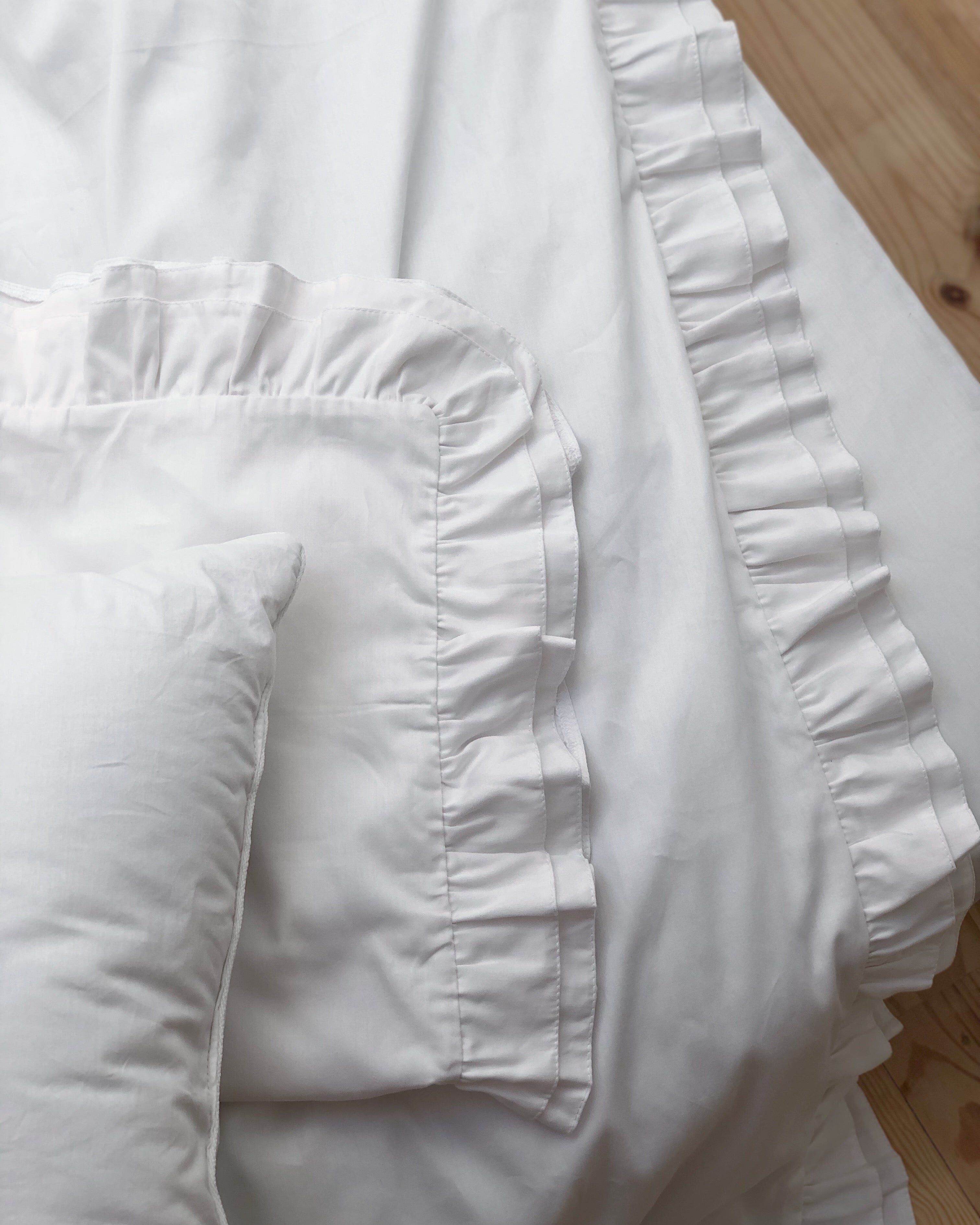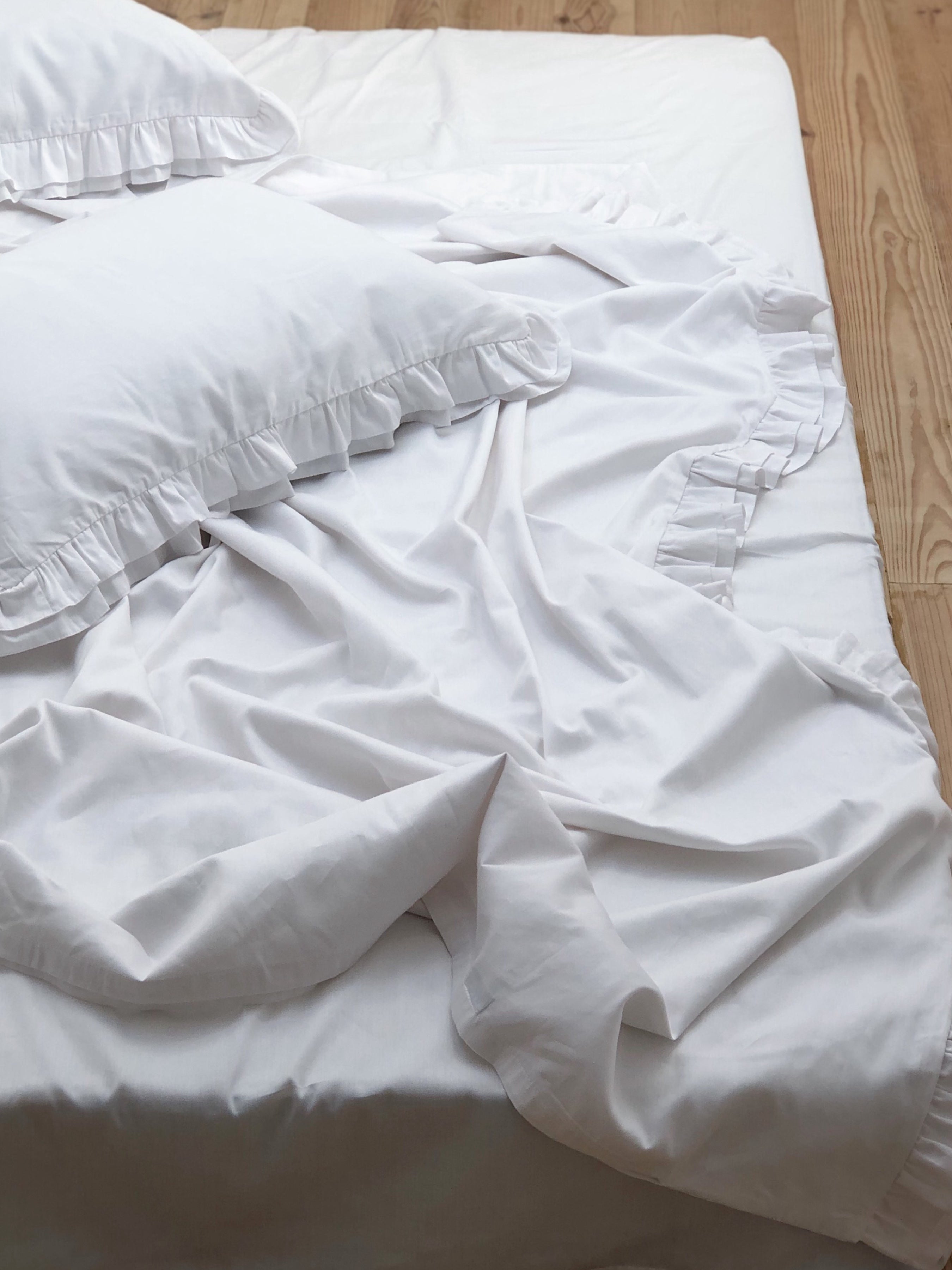 Pościel satynowa z merceryzowanej bawełny tureckiej 140 g/m² – biała z falbanką | Kolekcja Falbanki